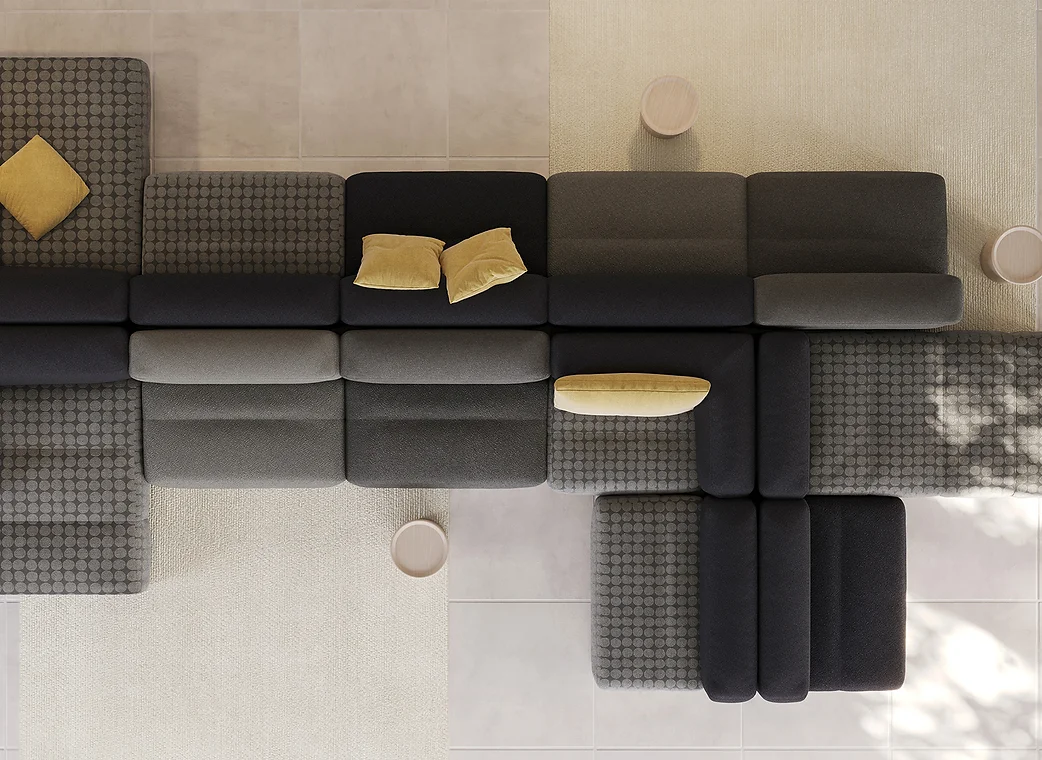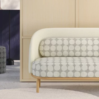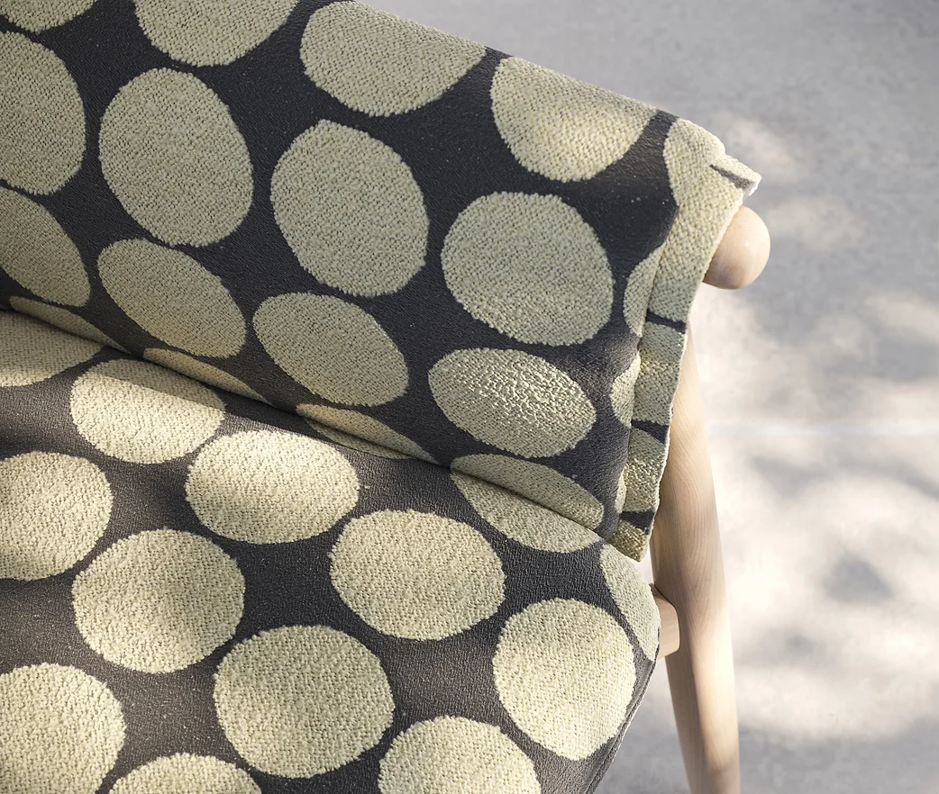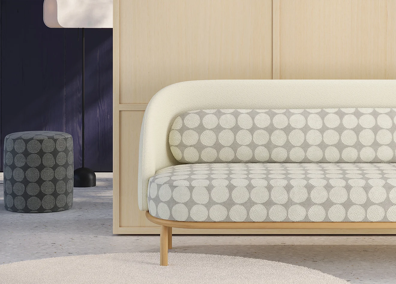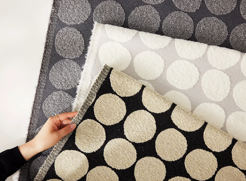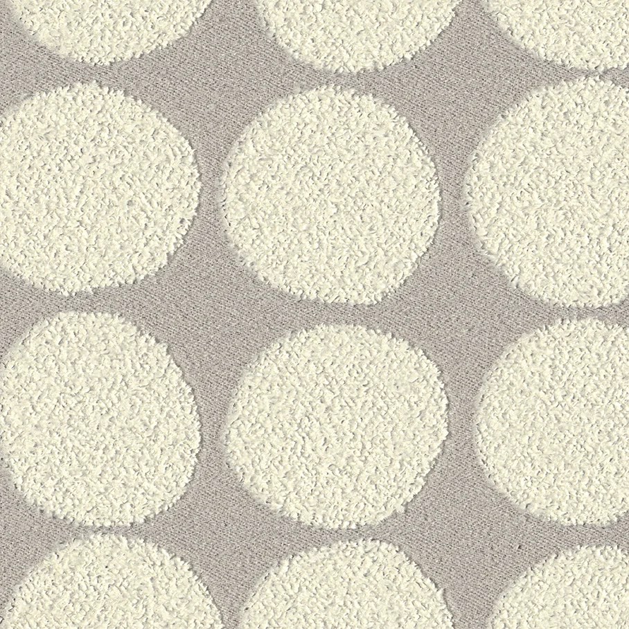 Joyful, large polka dots are created with soft, bouclé yarns which bring a gentleness to the pattern.
