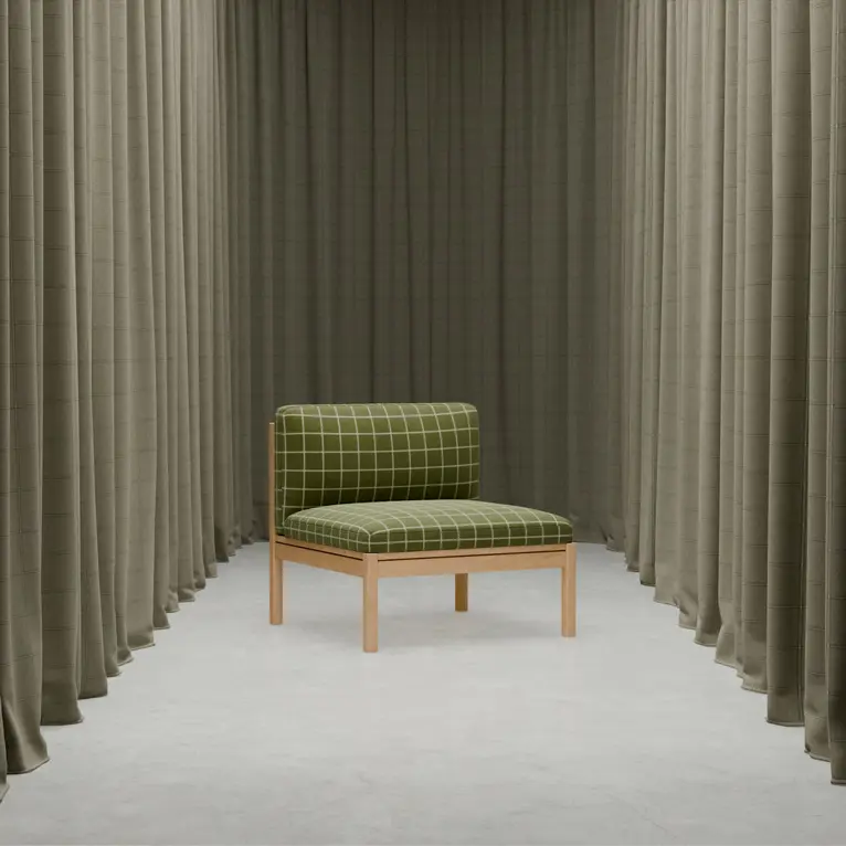 Uptown translates the rigid logic of the urban grid into something more fluid and emotional. With a 100 mm scale, the larger pattern references city blocks softened by natural textures, particularly mossy lines, creating a tactile dialogue between architectural structure and organic calm. The result is a fabric that feels both structured and serene, offering a unique way to divide, frame, or highlight spaces.