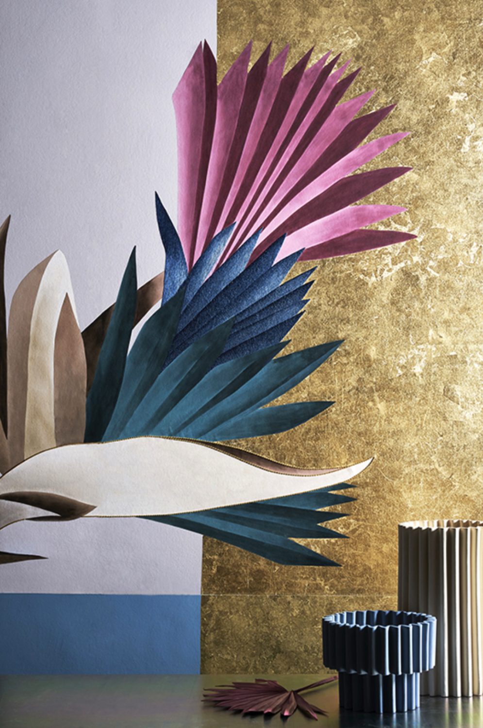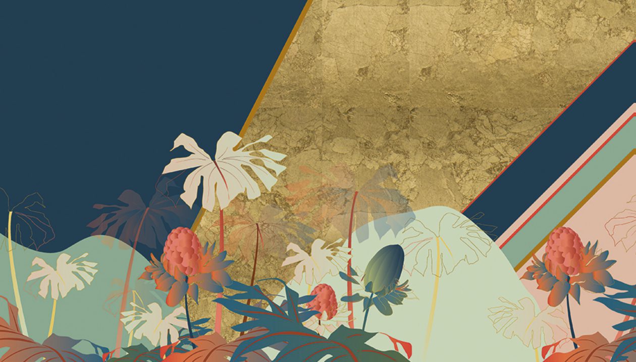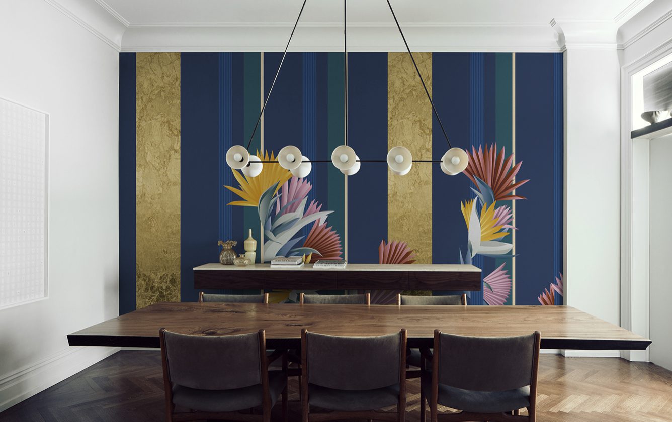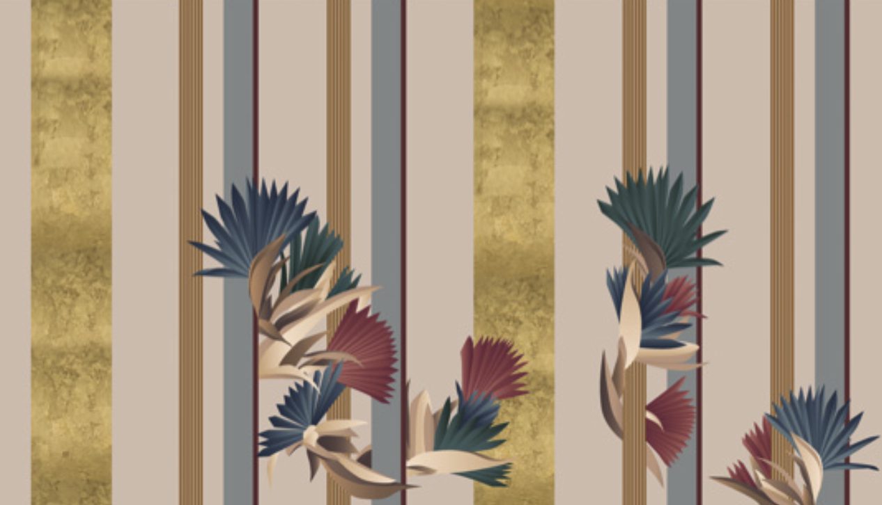 The protagonist of Kenzia is a natural and luxuriant wilderness. This wallpaper sets out to be an authentic praise of “vagabonds” (to quote Gilles Clement): wild plants constantly on the move. A colourful “out of scale” fan-shaped flora plays peek-a-boo in between the geometric stripes of an accurately drawn background. The overall effect is that of an on-going dialogue between order and disorder. The wallpaper is presented in two colour variants. Golden Sky and Golden Beach.