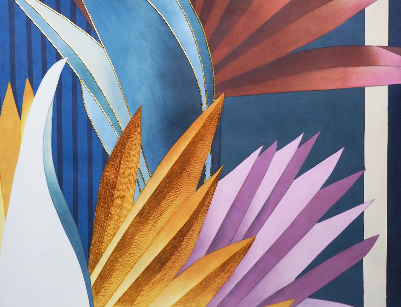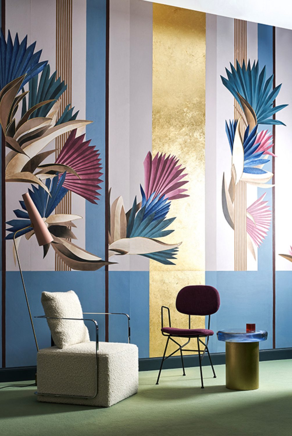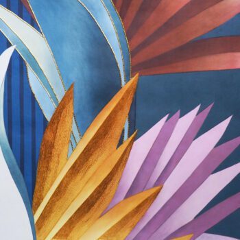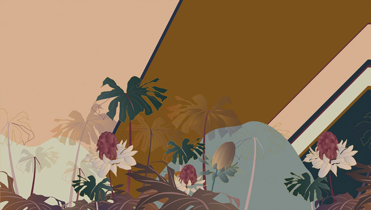 The protagonist of Kenzia is a natural and luxuriant wilderness. This wallpaper sets out to be an authentic praise of “vagabonds” (to quote Gilles Clement): wild plants constantly on the move. A colourful “out of scale” fan-shaped flora plays peek-a-boo in between the geometric stripes of an accurately drawn background. The overall effect is that of an on-going dialogue between order and disorder. The wallpaper is presented in two colour variants. Golden Sky and Golden Beach.