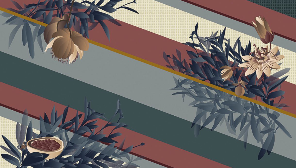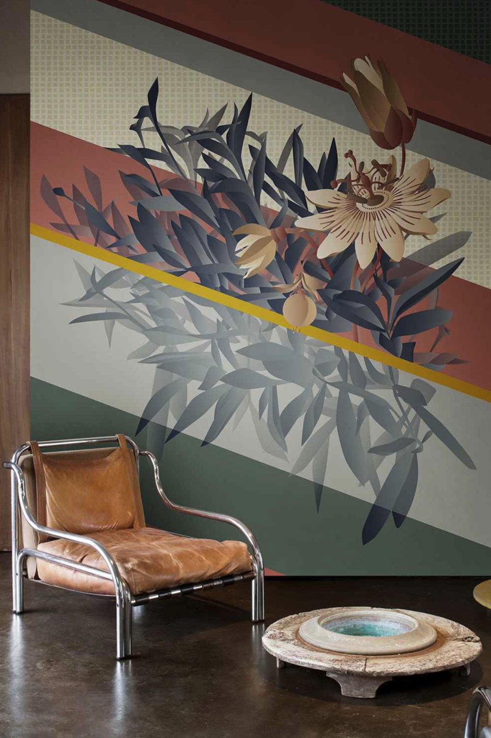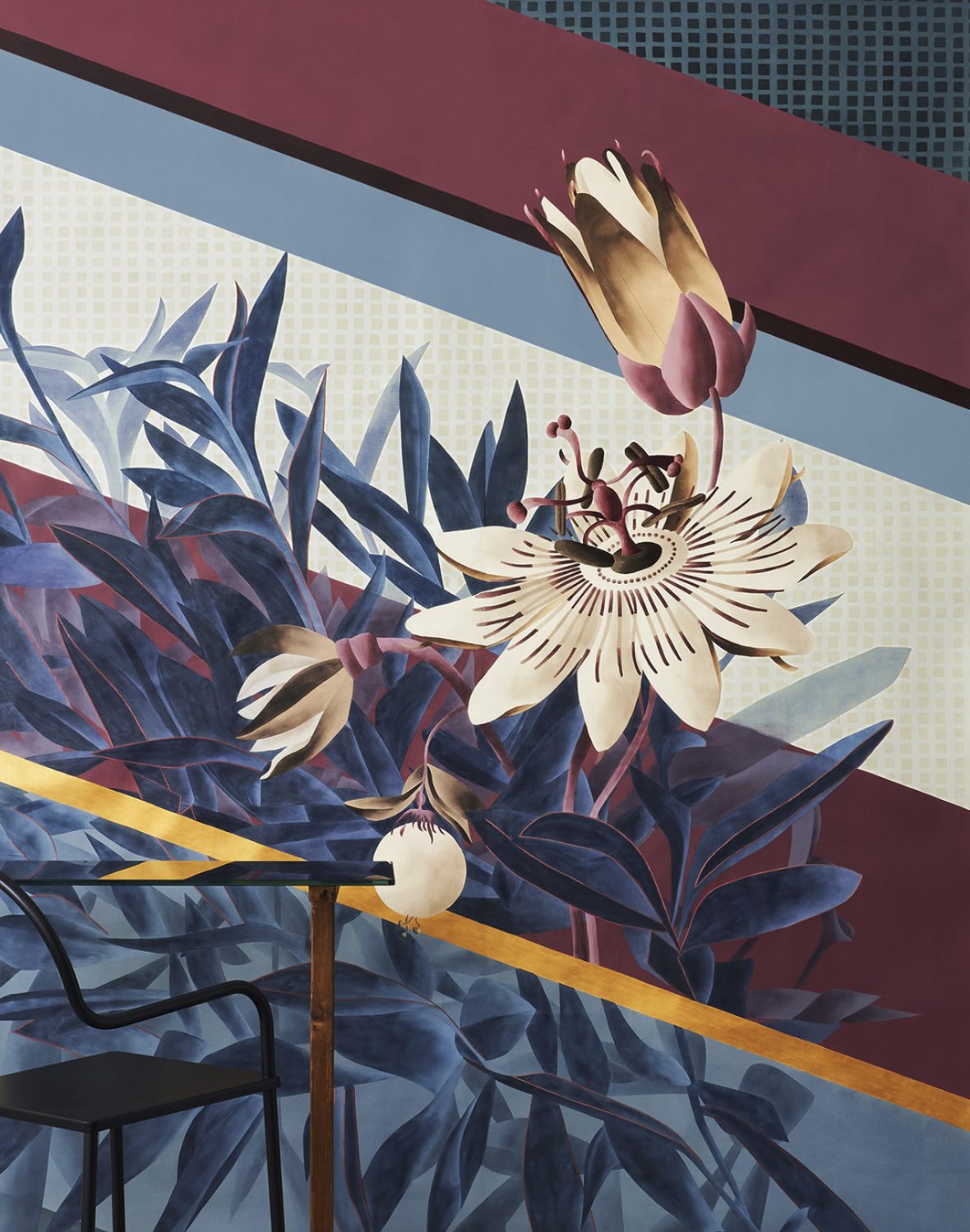 This wallpaper puts the spotlight on an exotic plant of great impact – passiflora – confined by a regimental diagonal pattern of monochromatic geometric stripes and micro patterns inspired by textured weaves. The striped background plays with transparent and opaque effects and interacts assertively with the vegetation. The wallpaper is further enhanced and characterized by hand-embroidered details which confer a pronounced three-dimensionality to the flower. The Passiflora design is presented in two colour variants, Citrina and Caerulea, which refer to the different colours of the flowers.