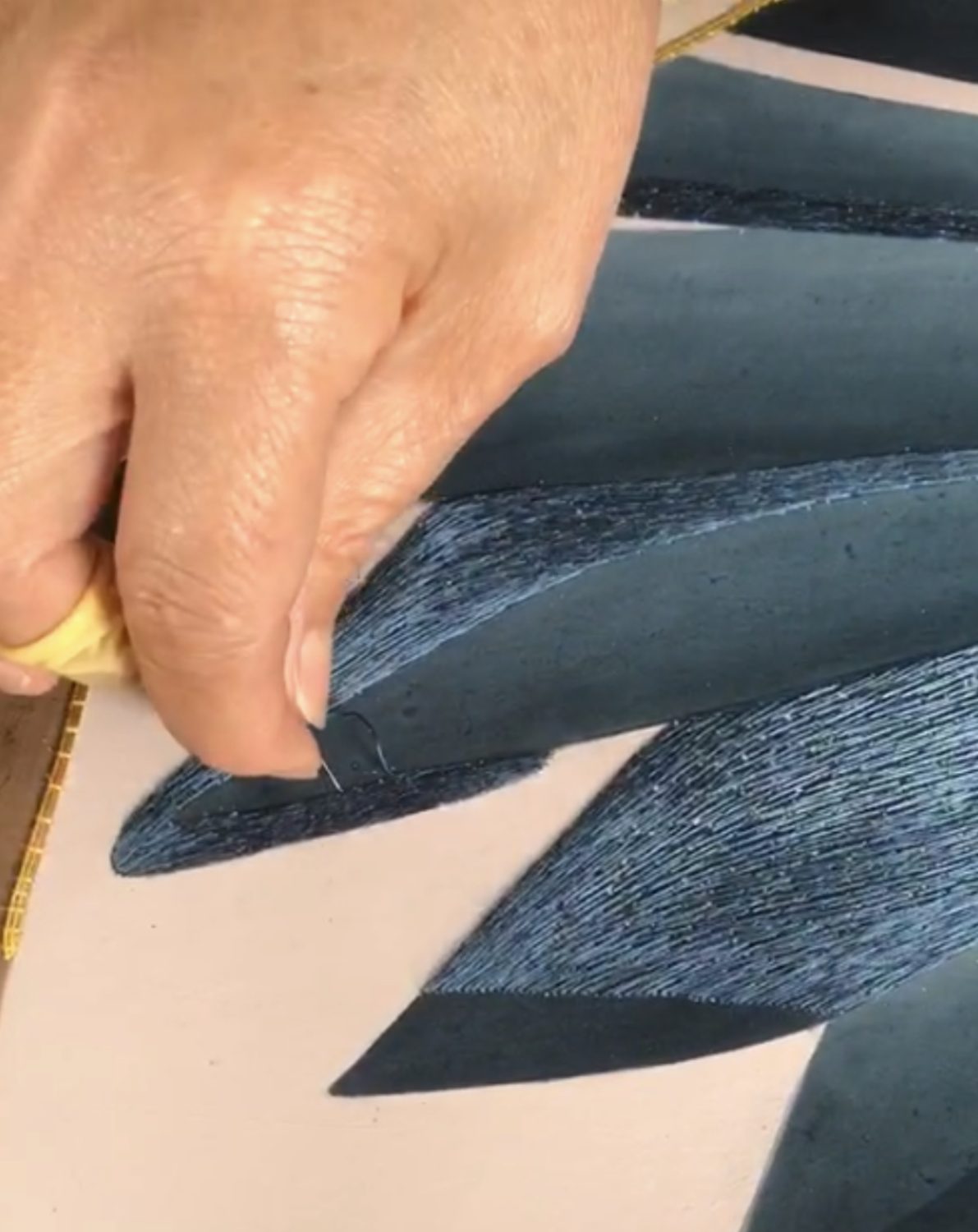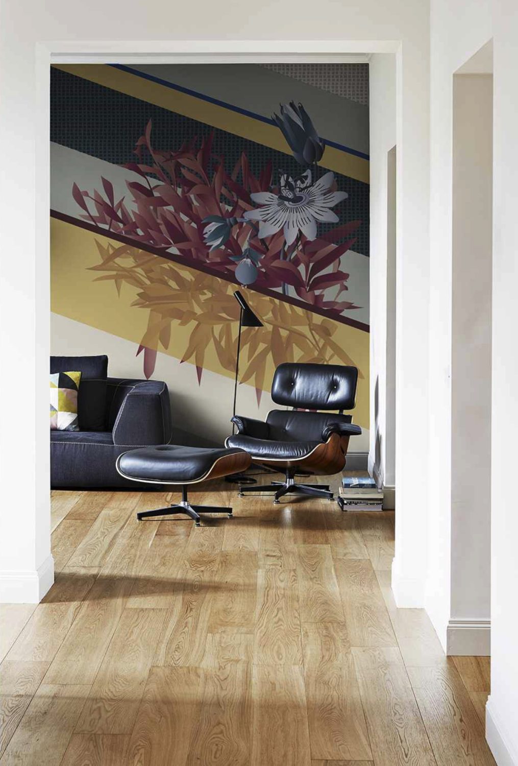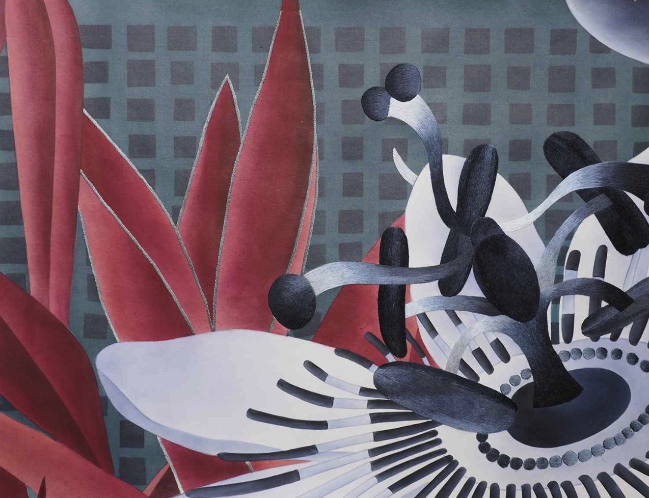 This wallpaper puts the spotlight on an exotic plant of great impact – passiflora – confined by a regimental diagonal pattern of monochromatic geometric stripes and micro patterns inspired by textured weaves. The striped background plays with transparent and opaque effects and interacts assertively with the vegetation. The wallpaper is further enhanced and characterized by hand-embroidered details which confer a pronounced three-dimensionality to the flower. The Passiflora design is presented in two colour variants, Citrina and Caerulea, which refer to the different colours of the flowers.