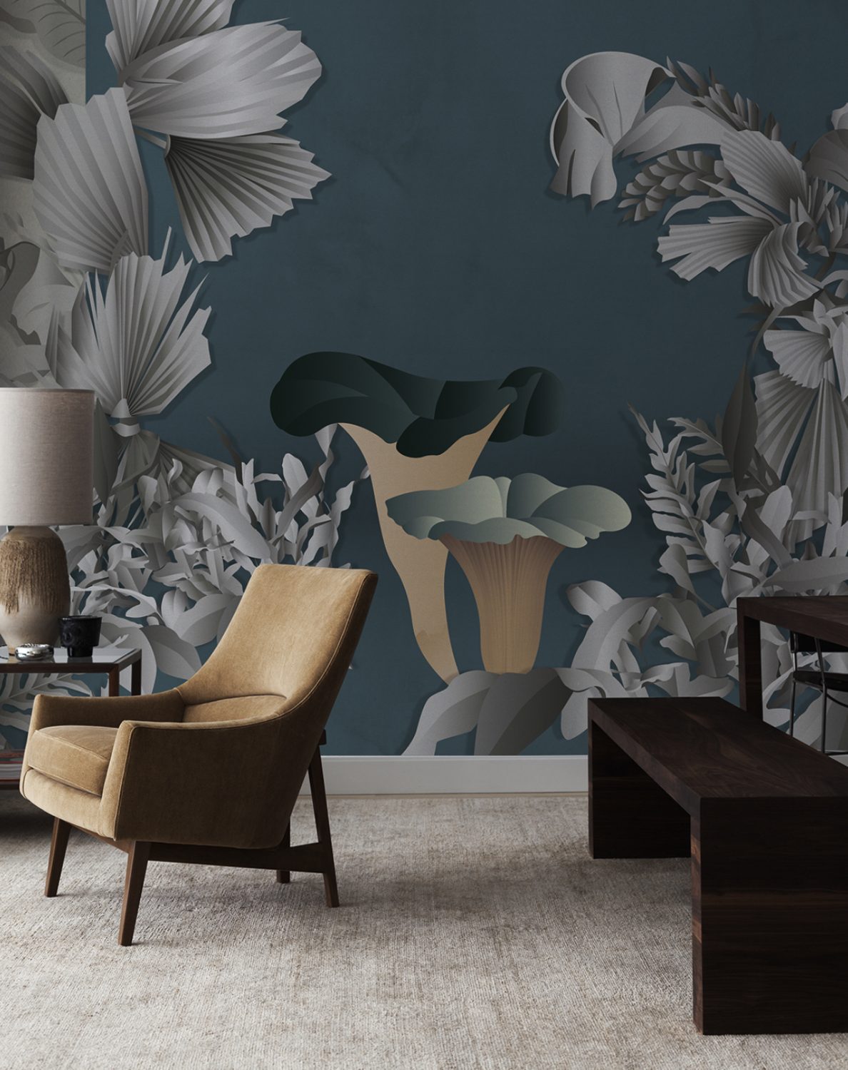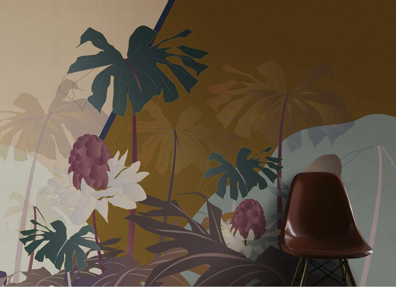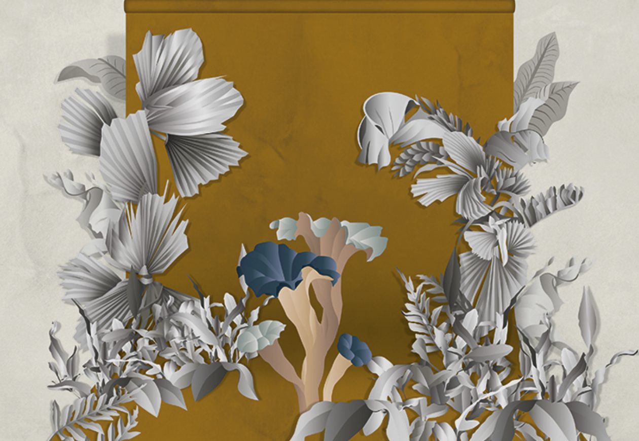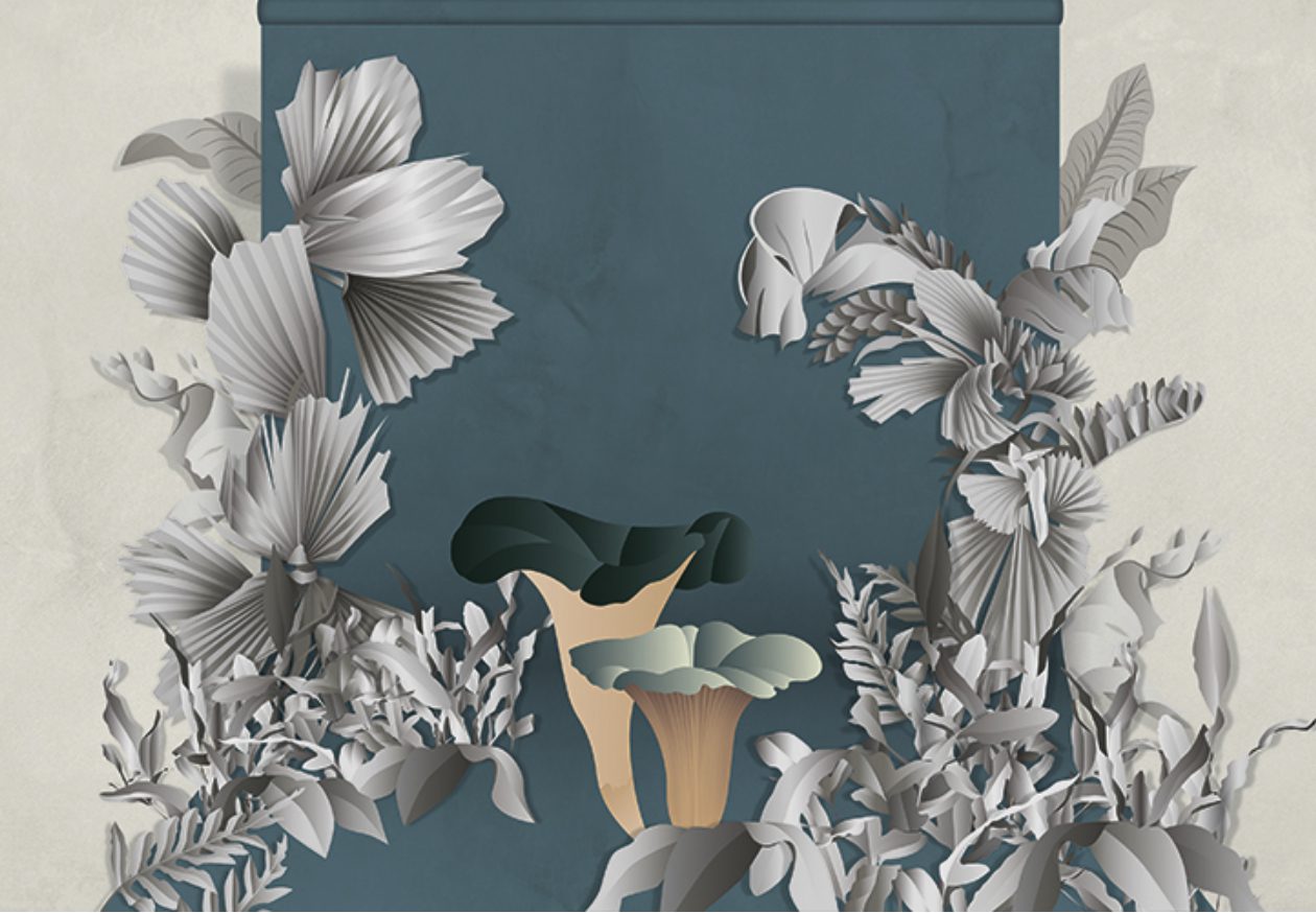 Formosa is a term often used in connection with certain mushroom varieties. This design experience takes its cue from the world of photography: a colourful limbo provides the backdrop to a hypothetical stage set imbued with a surreal dreamlike atmosphere. The limbo is interpreted by a solid colour background simulating the effect of marmorino stucco walls. Monochromatic ferns and exotic plants flank the limbo and frame the enormous mushrooms positioned in the foreground, which are characterized by bright, somewhat unnatural colours and endowed with three-dimensionality thanks to the embroidery work. Ardoise and Saffron are the two colour variants that refer to the dominant shades of the two different backgrounds.
