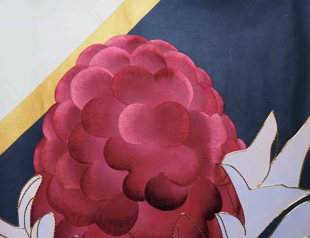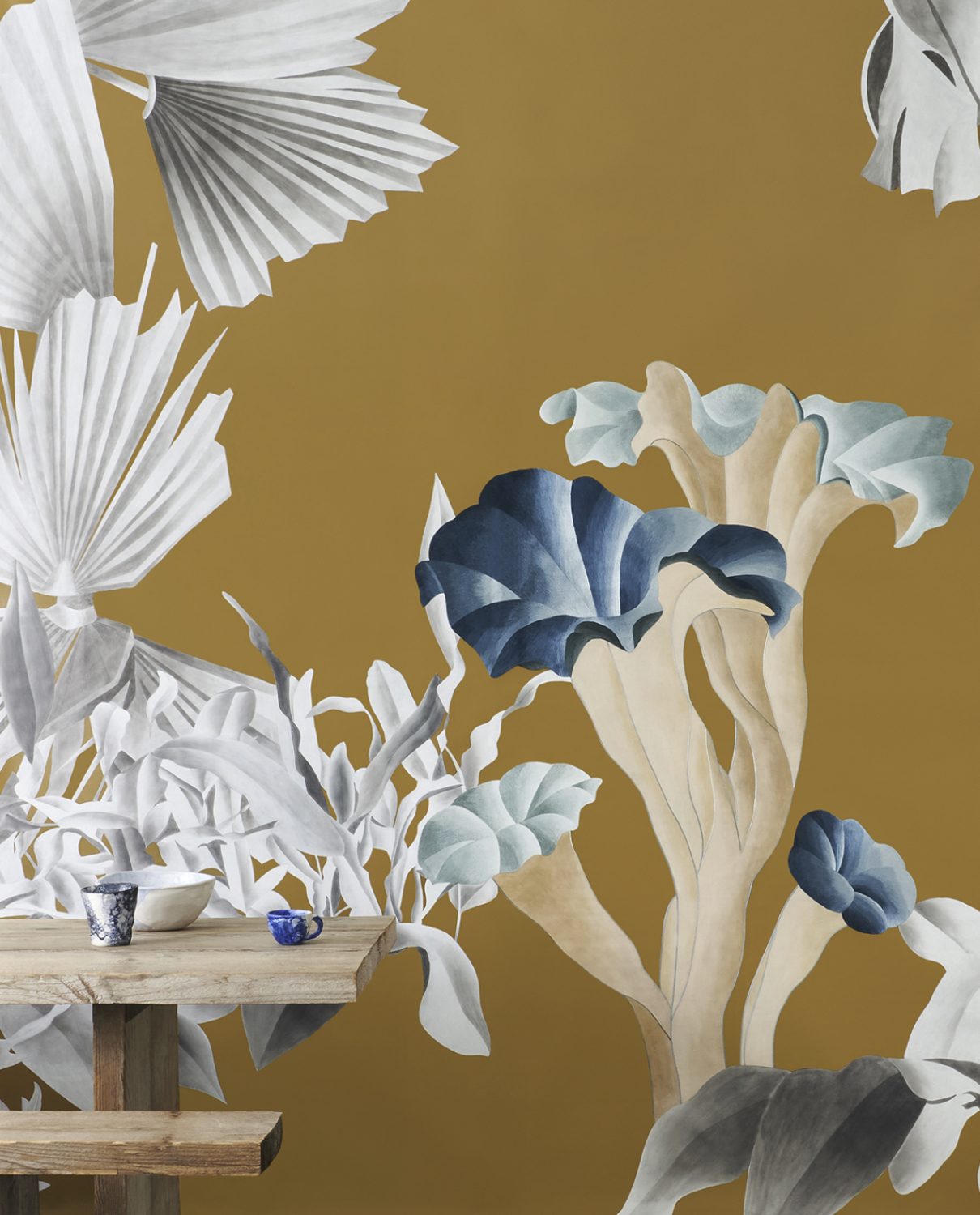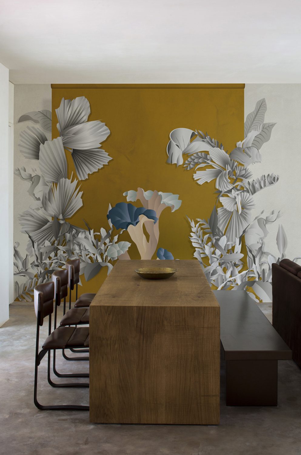 Formosa is a term often used in connection with certain mushroom varieties. This design experience takes its cue from the world of photography: a colourful limbo provides the backdrop to a hypothetical stage set imbued with a surreal dreamlike atmosphere. The limbo is interpreted by a solid colour background simulating the effect of marmorino stucco walls. Monochromatic ferns and exotic plants flank the limbo and frame the enormous mushrooms positioned in the foreground, which are characterized by bright, somewhat unnatural colours and endowed with three-dimensionality thanks to the embroidery work. Ardoise and Saffron are the two colour variants that refer to the dominant shades of the two different backgrounds.