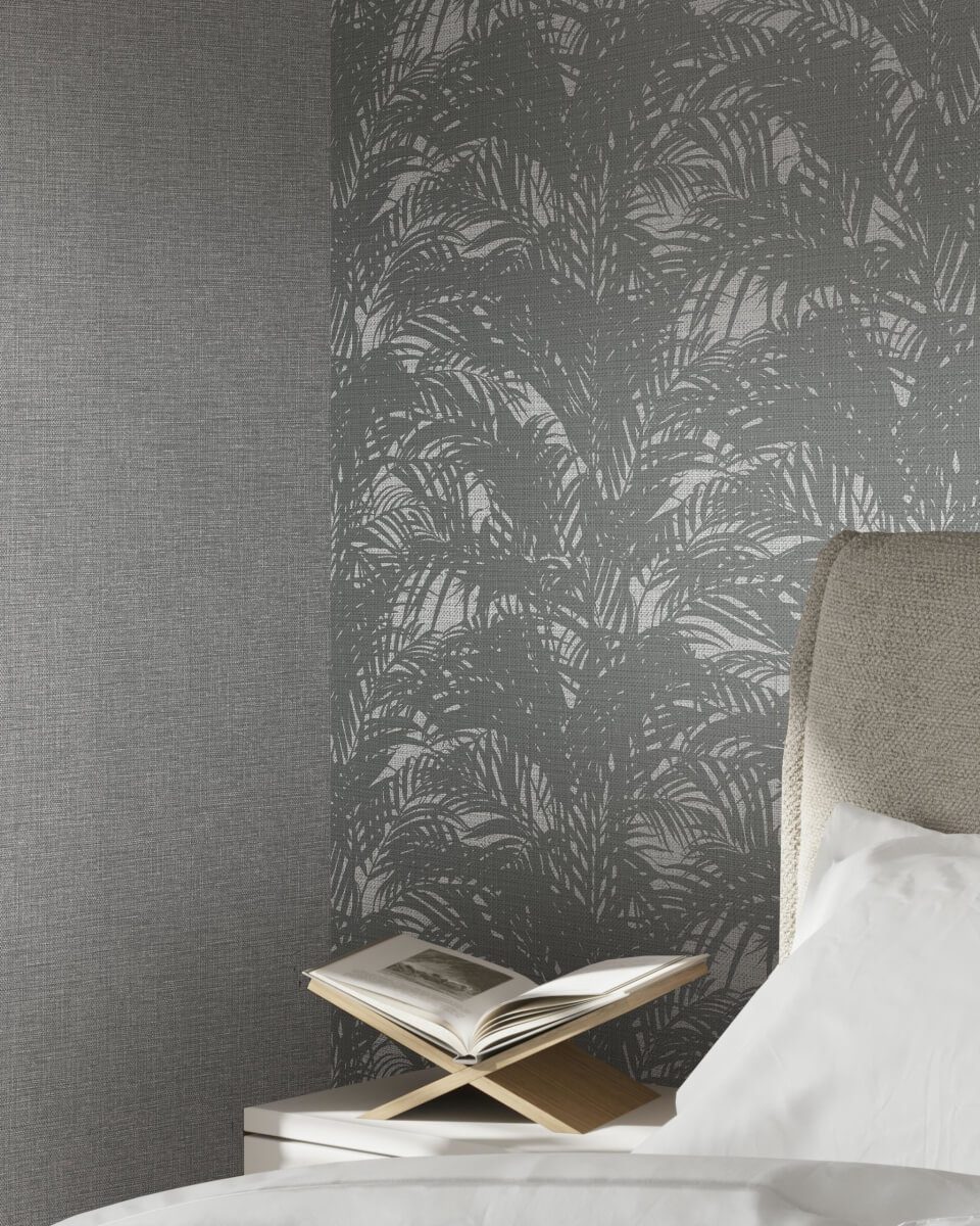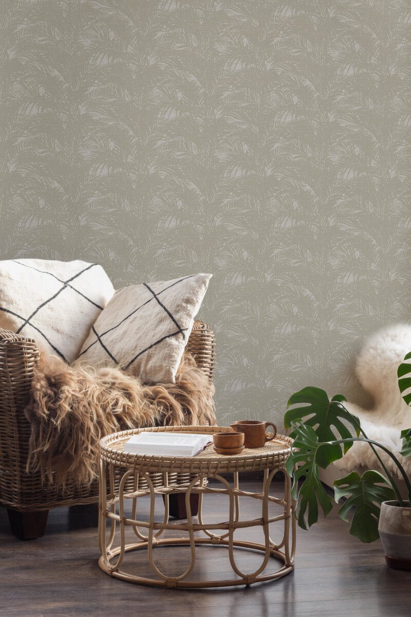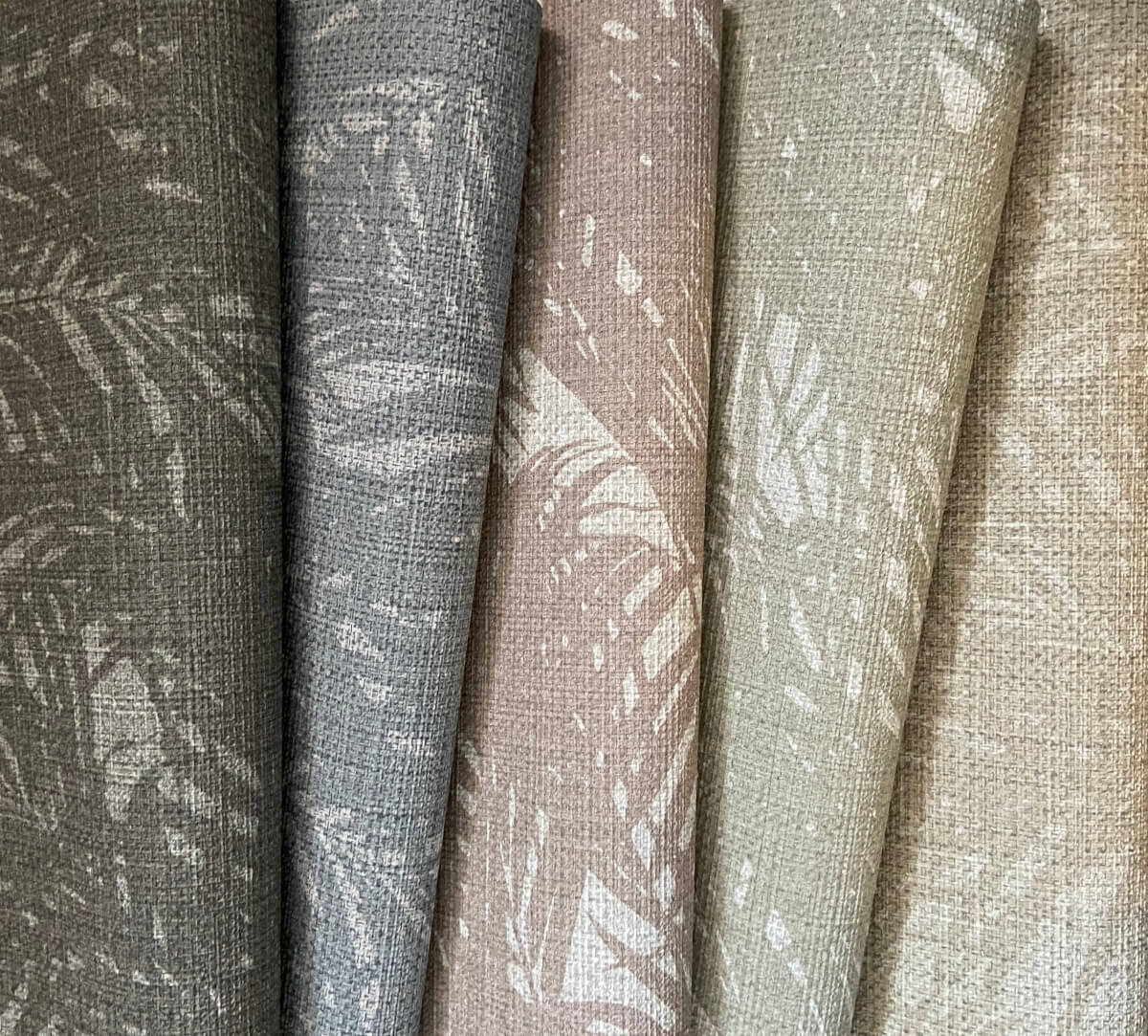 Bali adds a soft palm print to the Hessian plain. The delicate transparent print allows the hessian texture to show through, creating the effect of a palm tree casting a shadow onto the wall.