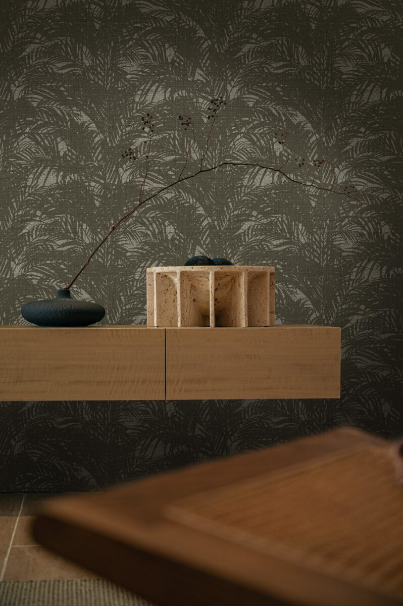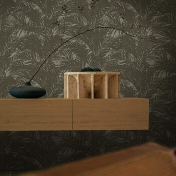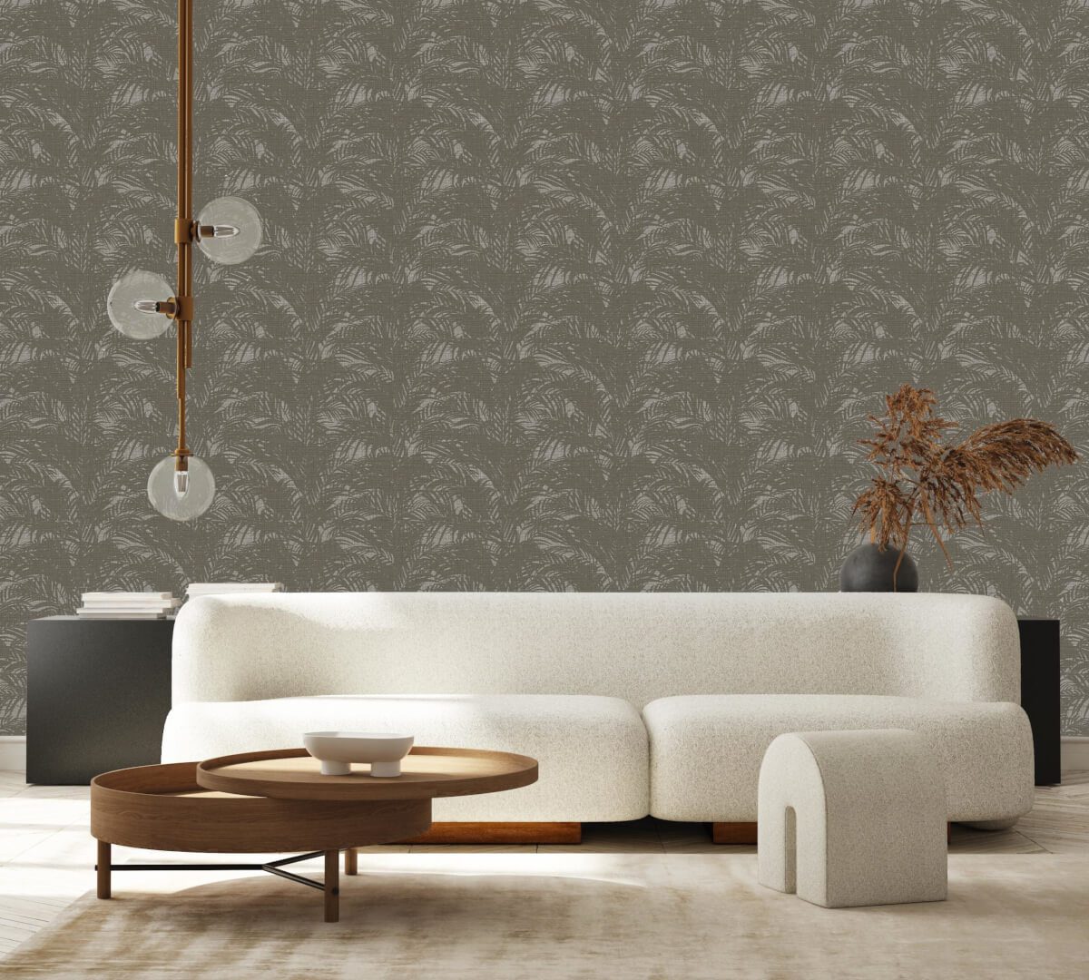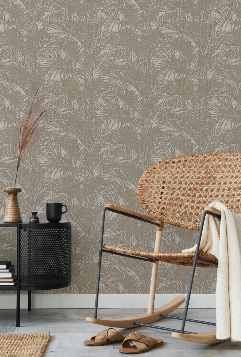 Bali adds a soft palm print to the Hessian plain. The delicate transparent print allows the hessian texture to show through, creating the effect of a palm tree casting a shadow onto the wall.