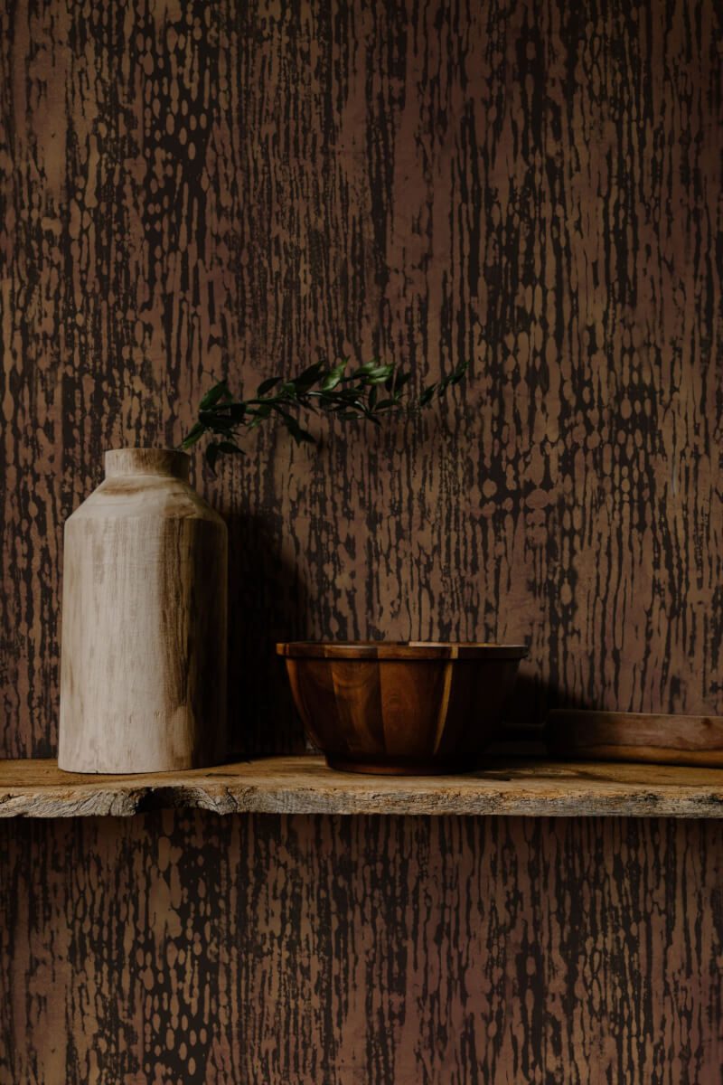Tapping into the trend of resistance dying techniques, our Batik design was derived from a hand-dyed piece of fabric. In addition to the delicate tonal background print, the emboss we’ve used adds to the tactile feeling of creased fabric after the dying process. Traditionally batik dyes came from natural plant sources. The most widely used were indigo blue and soga, a warm brown colour made from the bark of the soga tree. We have used these and continued the natural dye theme throughout the rest of the palette.