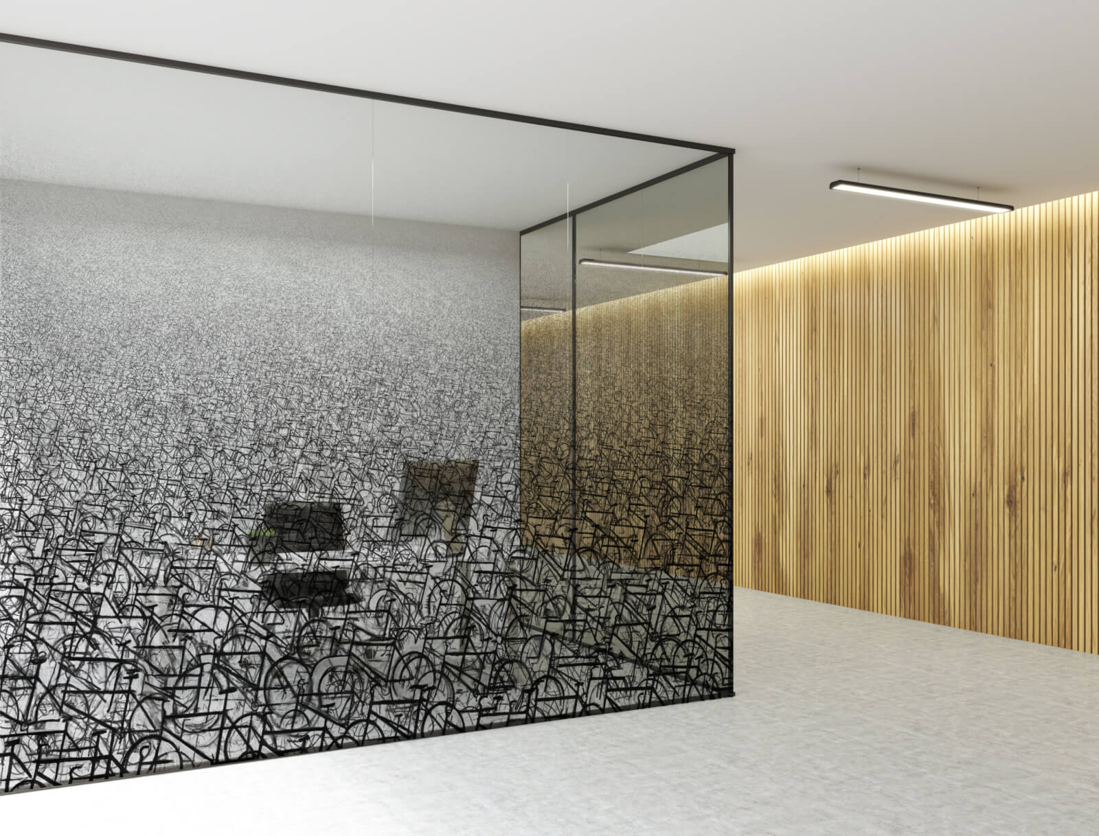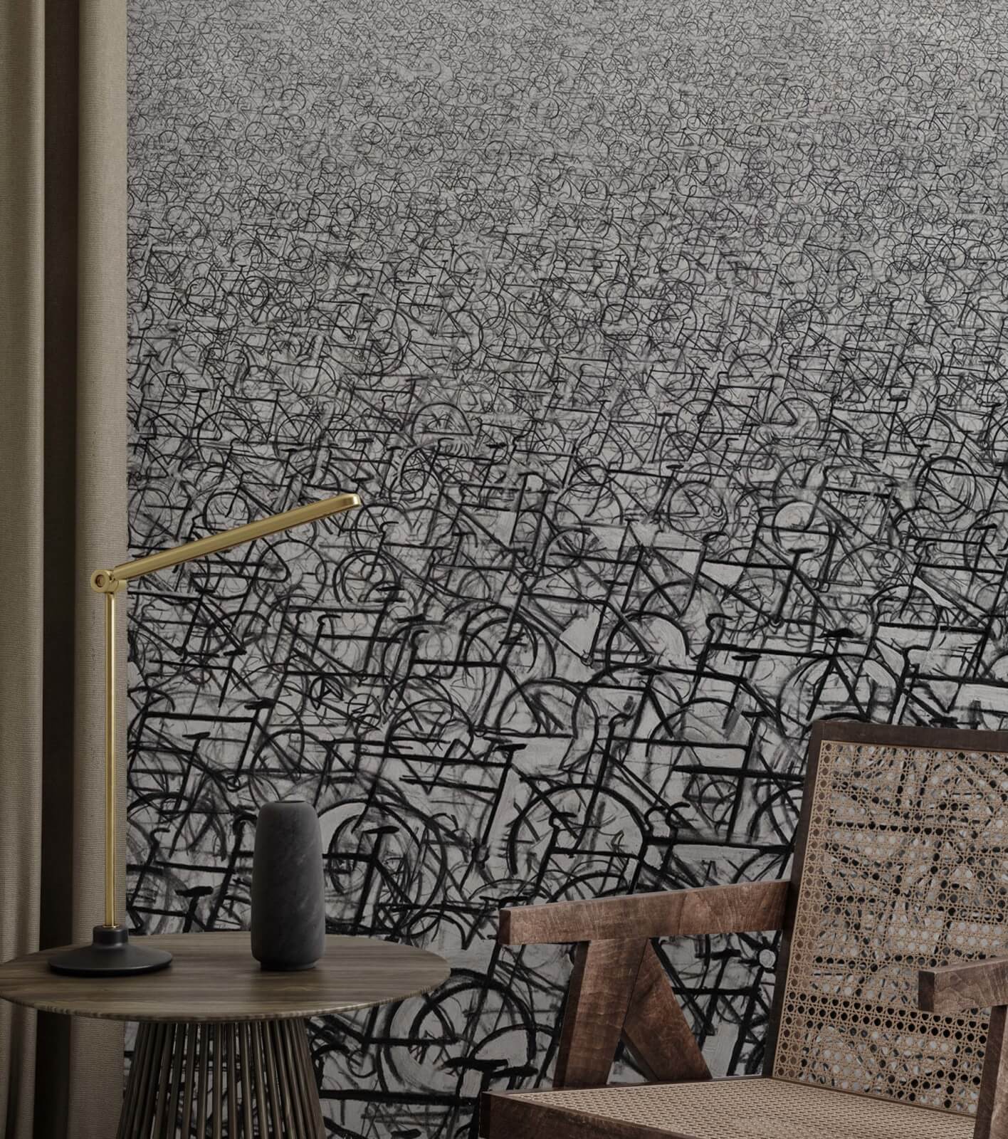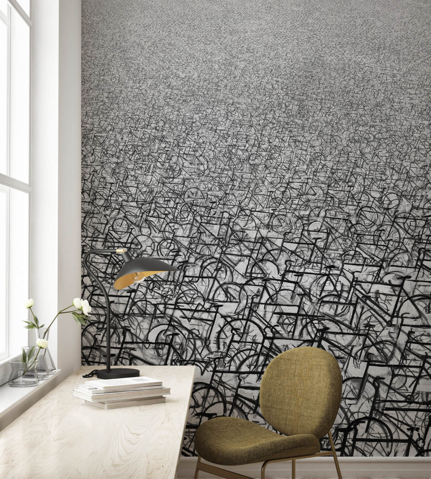 A sea of bicycles! Hand-drawn by artist Stephen Walter and faithfully reproduced as a wallcovering. Can be printed onto any of our base materials including textures, colours, metallics and window films.