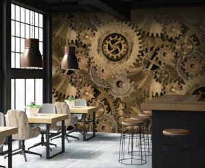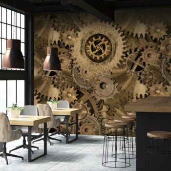Makina translates as machine in several languages. This large scale design takes a closer look at the inner workings of industrial machinery. Printed onto a mylar base, the high shine metallic accentuates the burnished textures of raw metal.  Makina is part of our Industrialis collection; a refined 3 dimensional collection inspired by the quiet luxury trend. Beautifully bold yet sophisticated designs enhanced by textured & mylar bases combine intrigue and elegance with a distinctive industrial influence. Wood, stone concrete and metal feature in this dramatic collection which celebrates raw materials and artisan craftmanship. Printed on our Mylar base as standard – this can be customised on request. All of our digital designs can be recoloured and rescaled. We also stock a wide selection of vinyl embossed bases to choose from as well as mylar and window films.