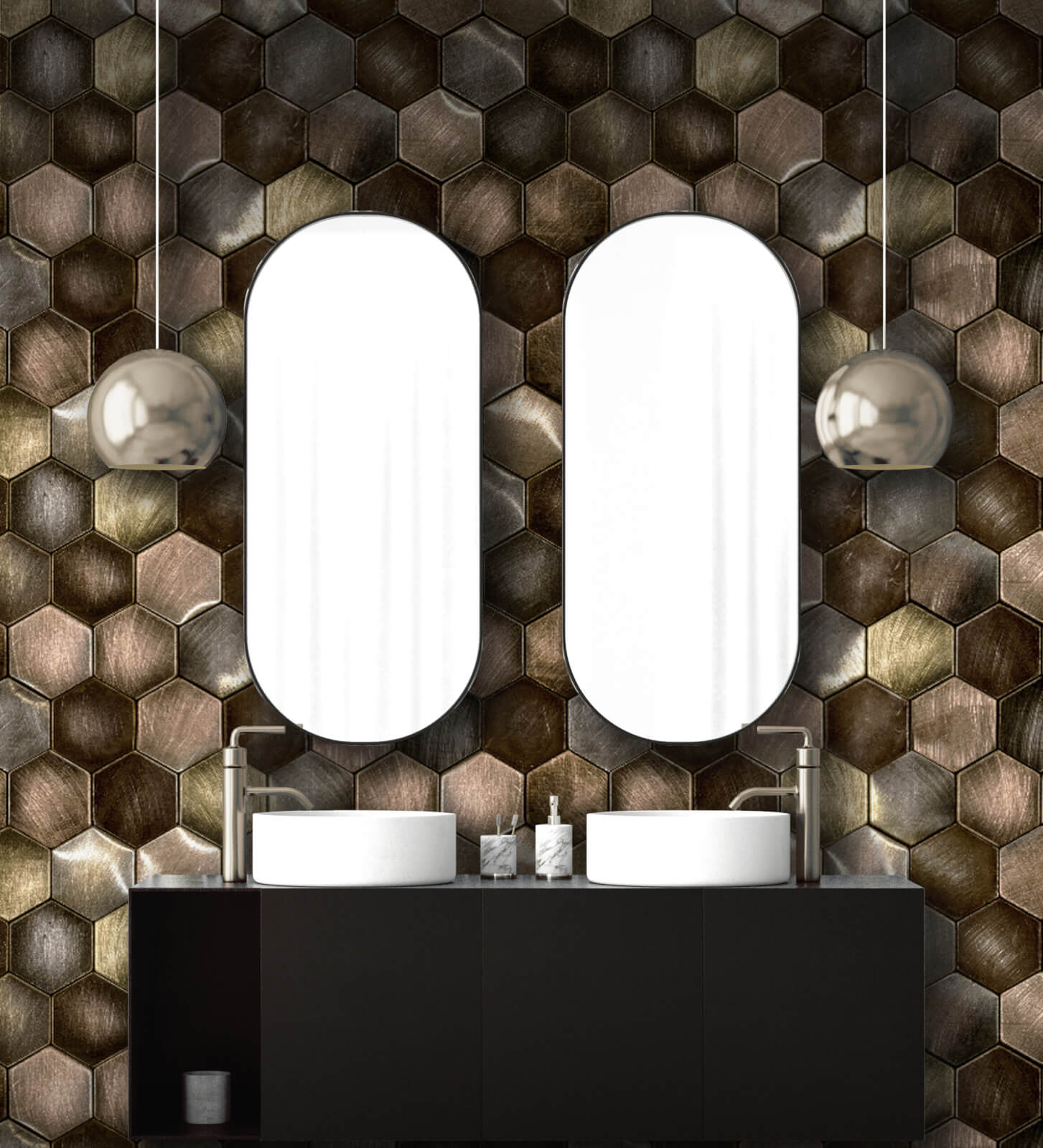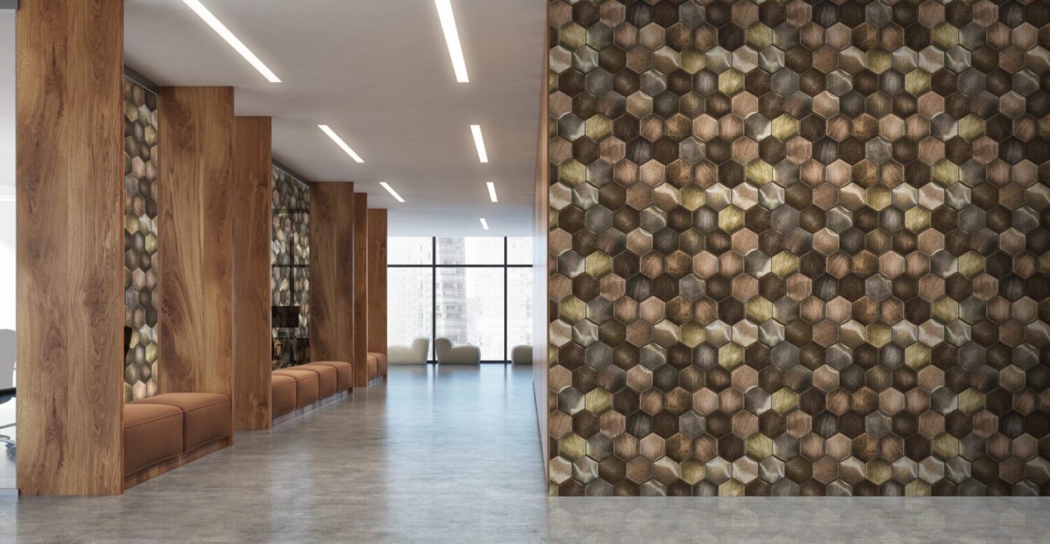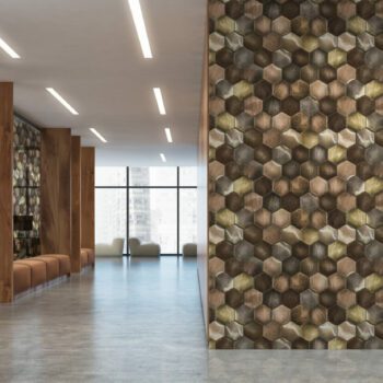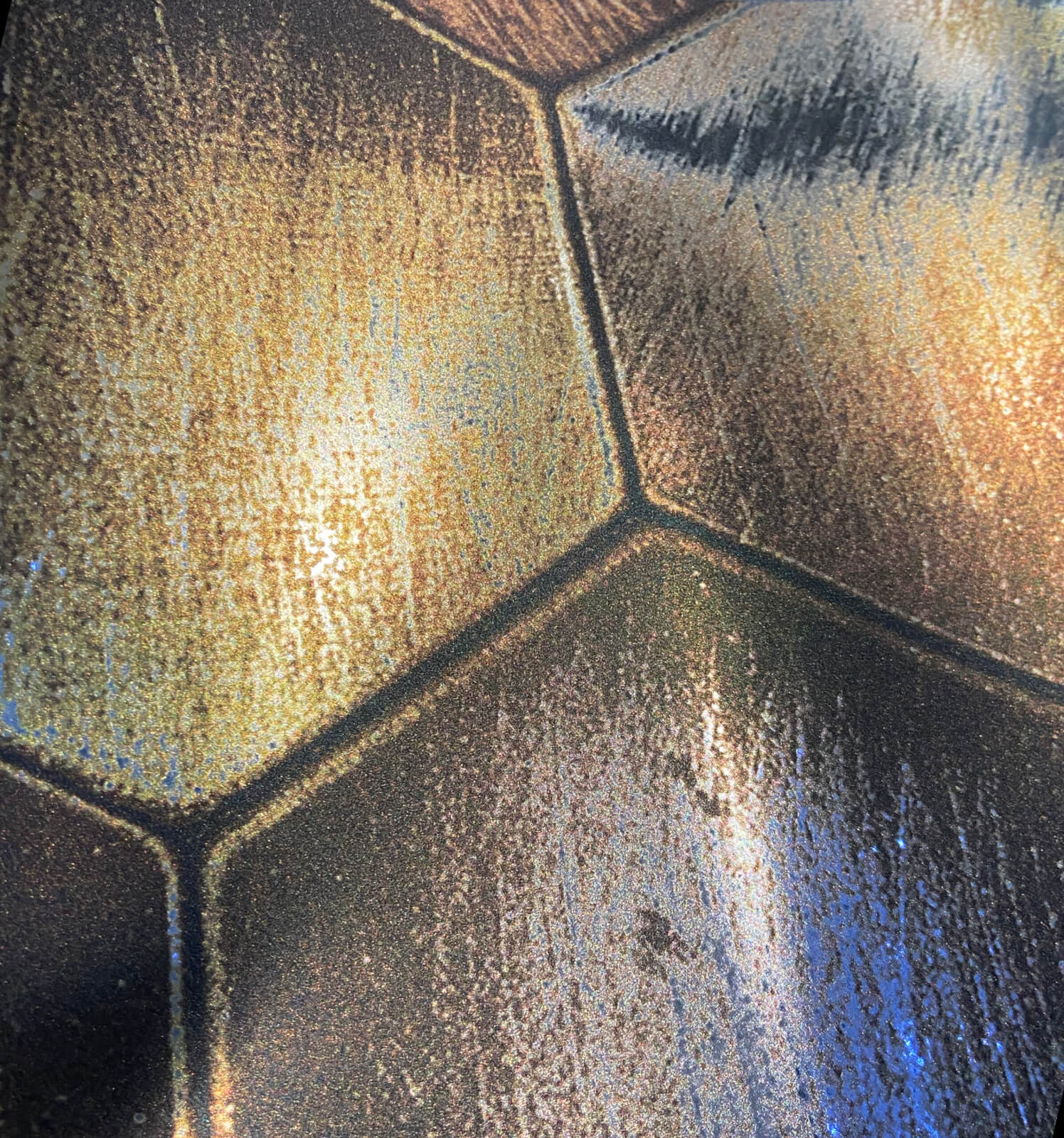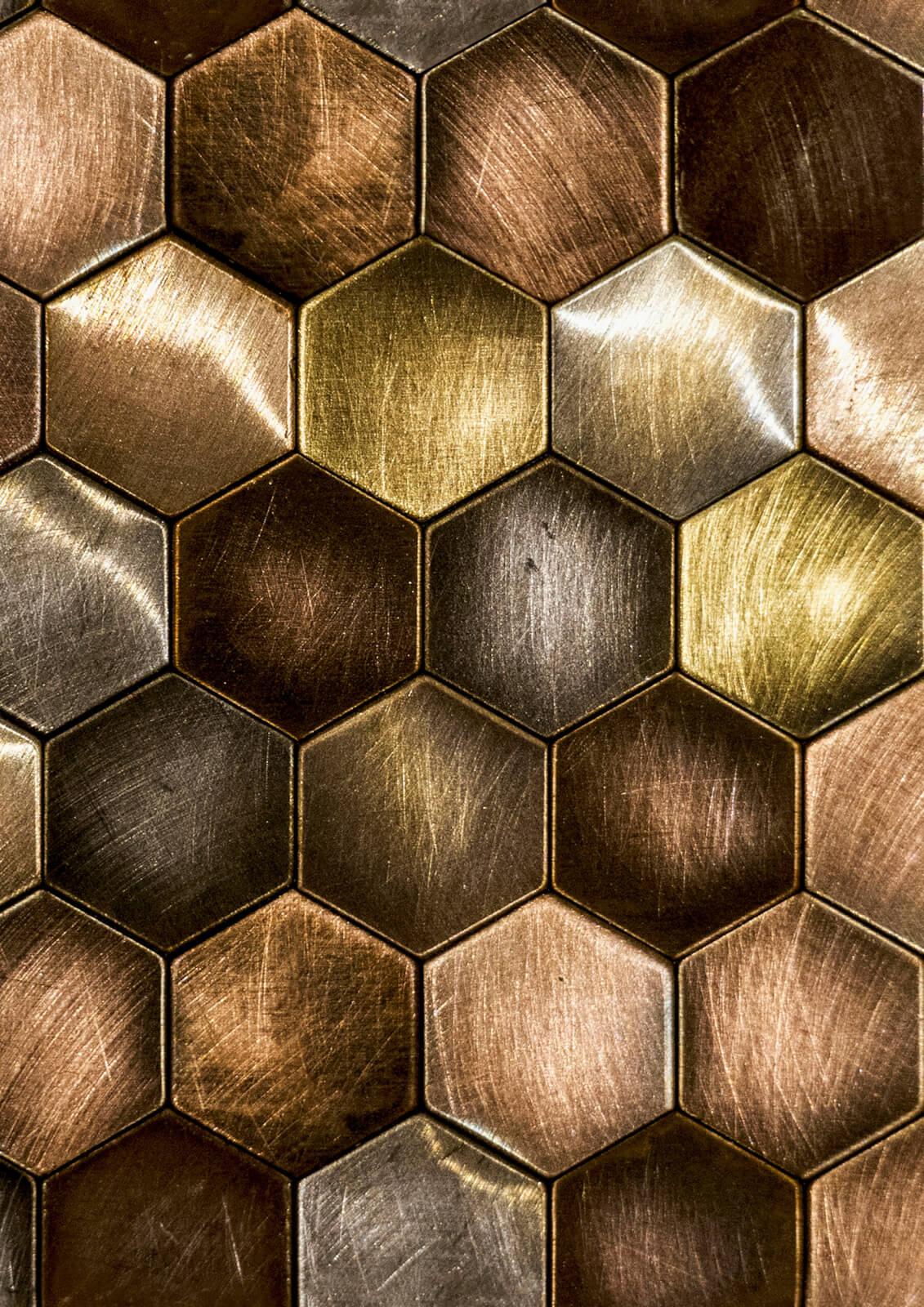 Tessellating hexagonal tiles with weathered textured details, create a honeycomb effect with warm metallic tones layered onto a high shine mylar ground.
