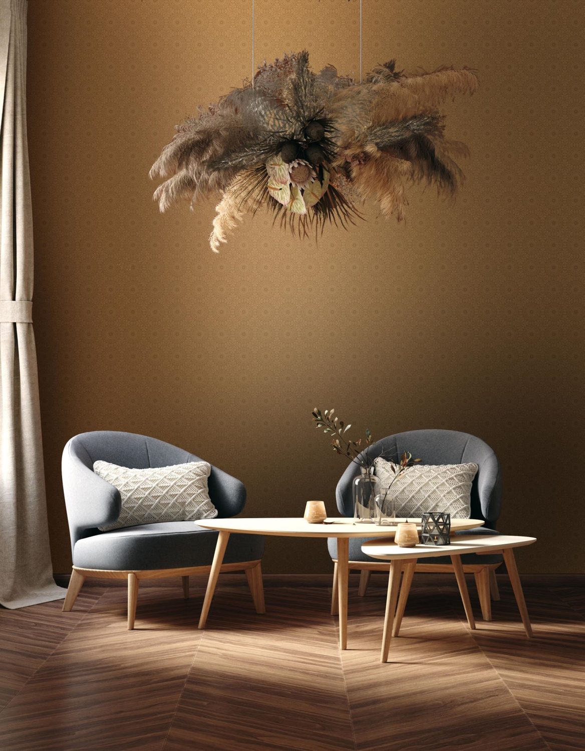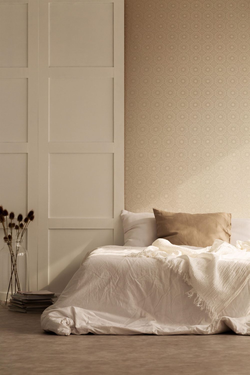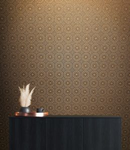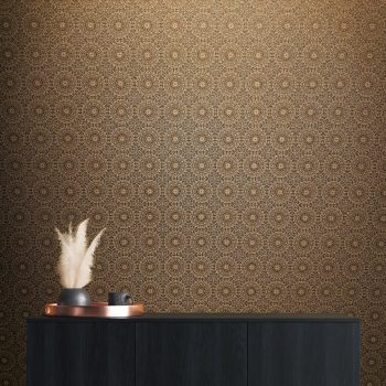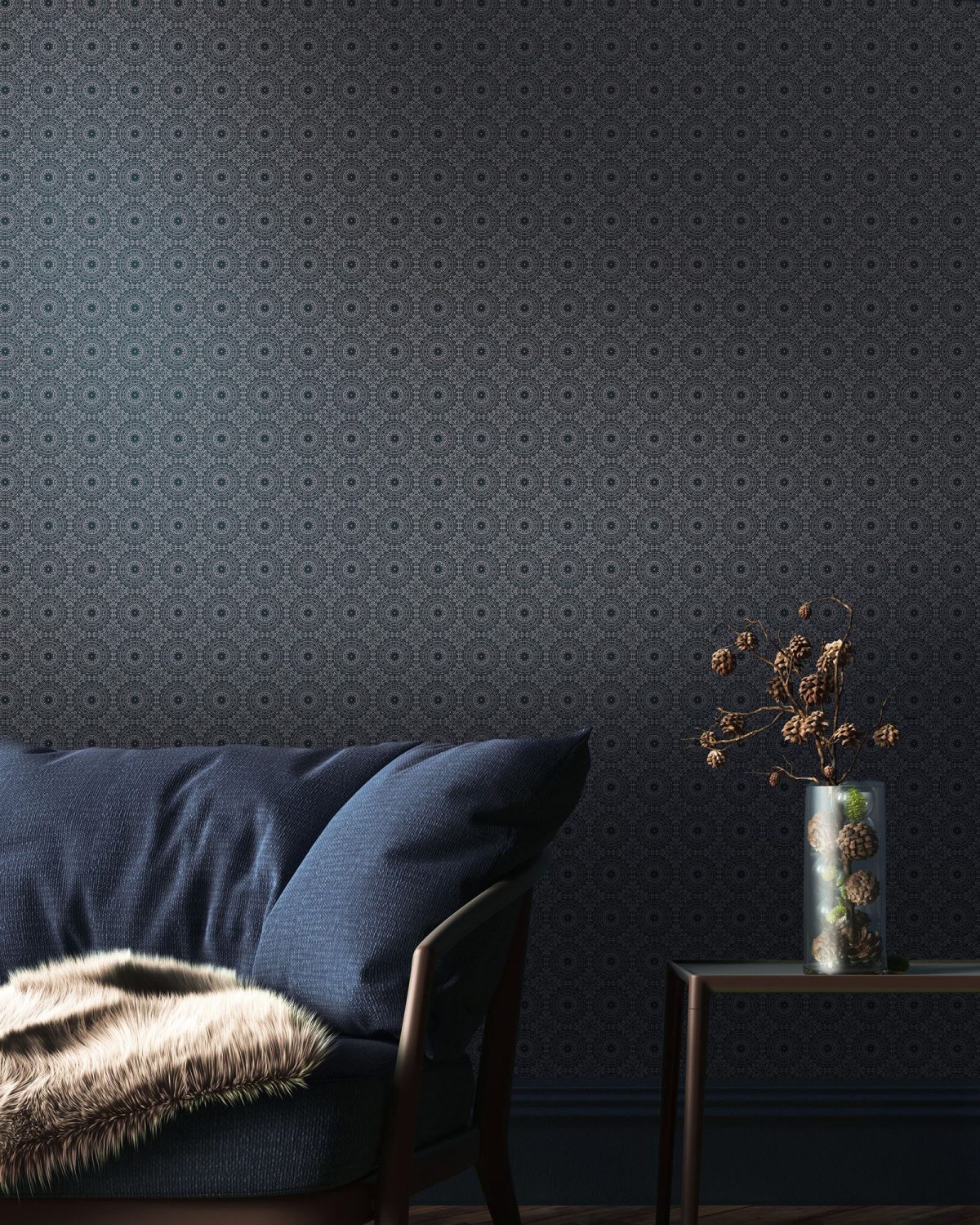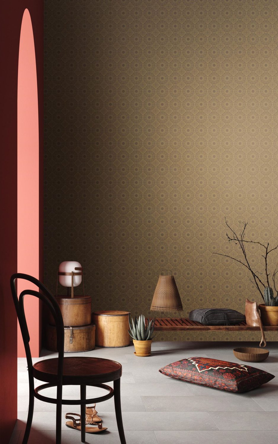 This delicate lacey mandala pattern was inspired by the global eclectic trend that we’ve seen so much of recently – layered identities, pattern clashing and a warm, spicy palette with indigo, copper and terracotta accents. We love the tonal metallic print against a rough, stone-like emboss.