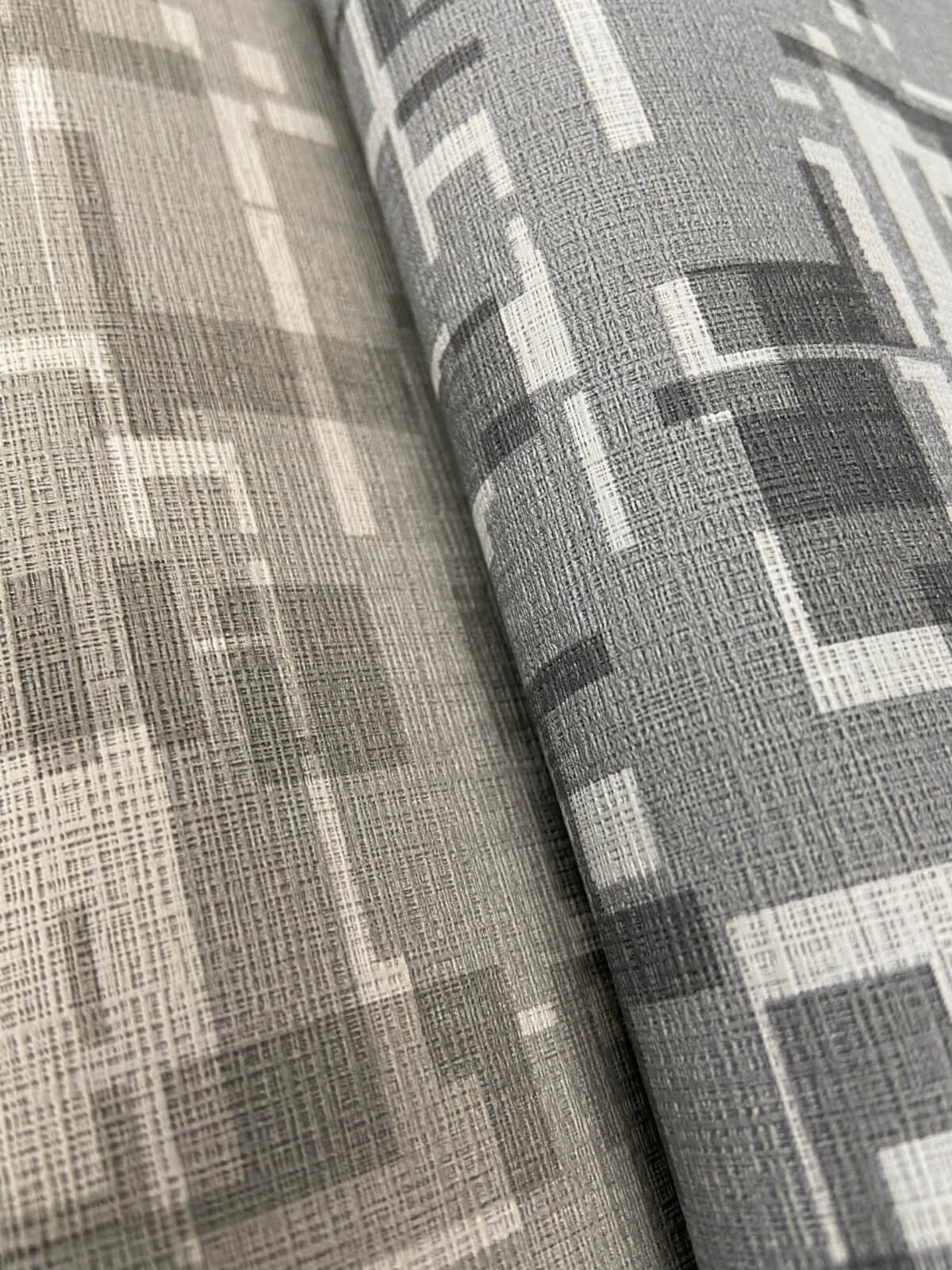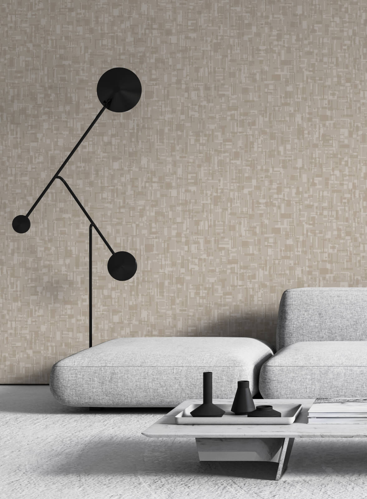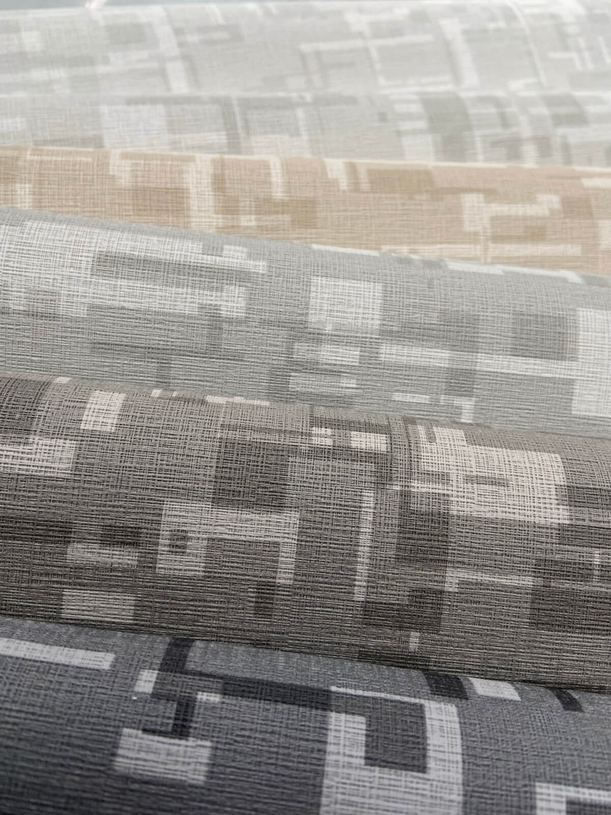 Shadowy layered geometric shapes on a soft woven background in a warm neutral palette.