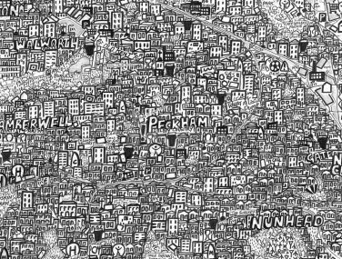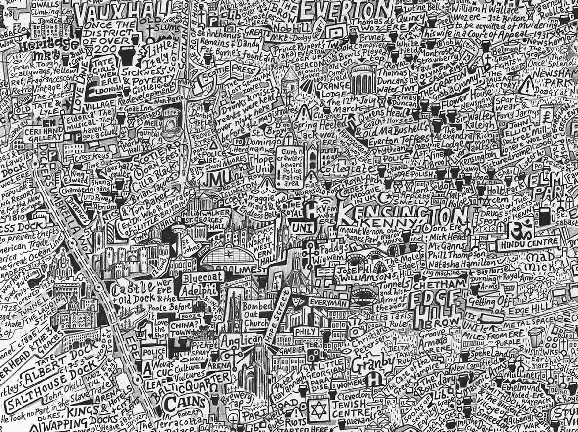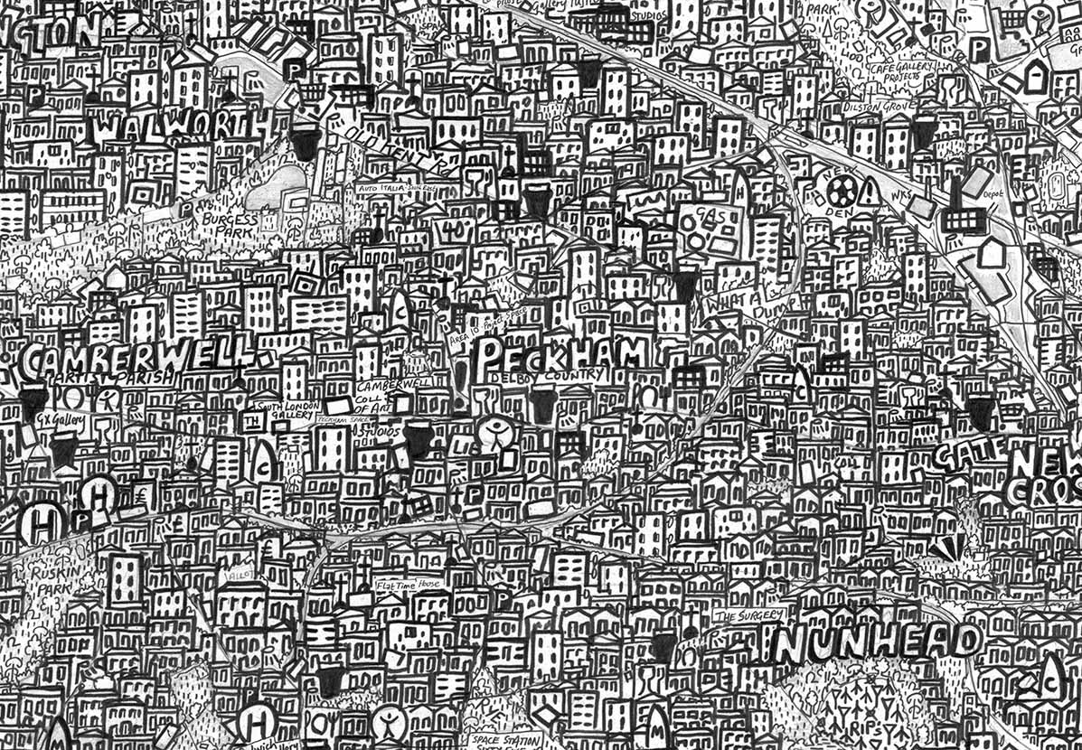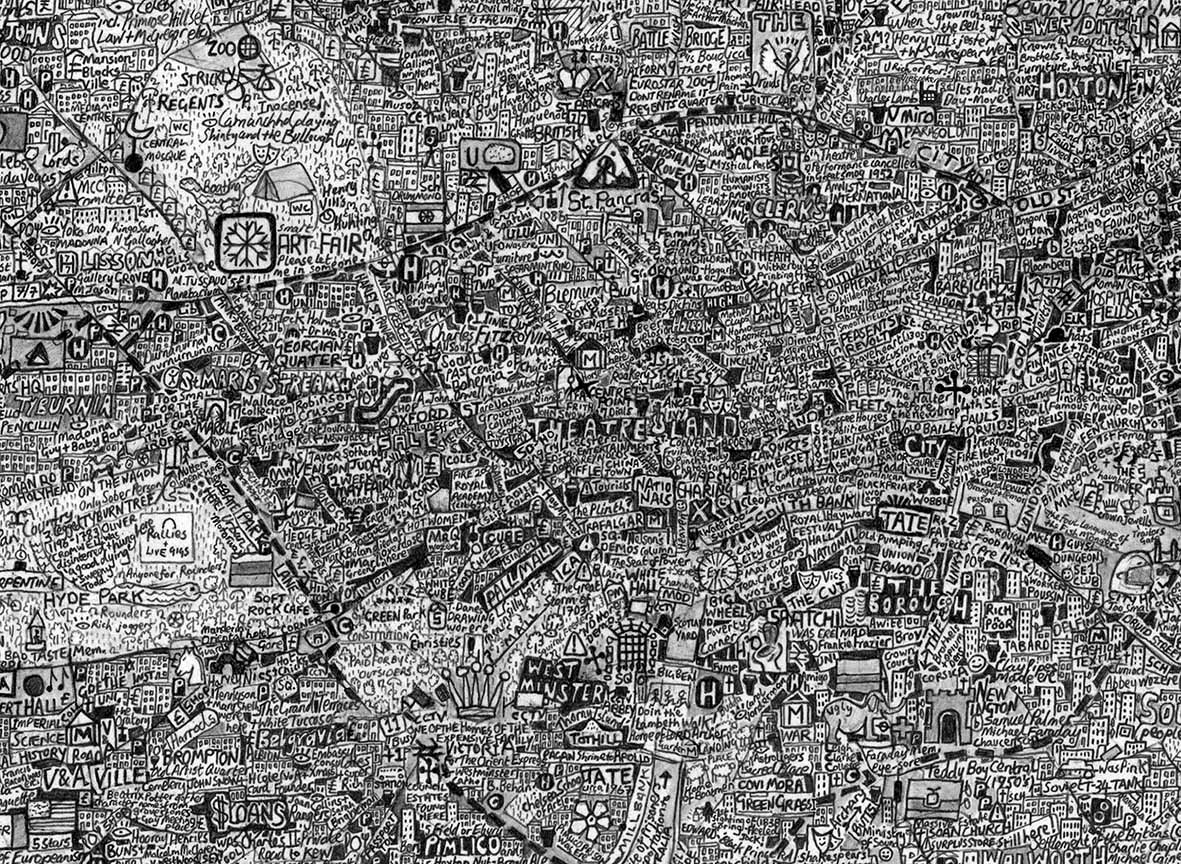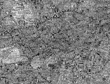 Stephen’s drawings are a tangle of signs, words and images that draw the viewer into the artist’s intricate worlds. A graduate of Manchester Metropolitan University and the Royal College of art, he is best-known for his series of hand-drawn maps, done in enormous detail and layered with both visual and textual information. Each work is an intricate world in itself; a tangle of words and symbols that make up a complex of hidden meanings and wider contradictions. Through drawing, photography and printmaking, his artworks explore the meaning of objects, the glory of maps, our place in the world, and the potential legacy that we bequeath to future generations.