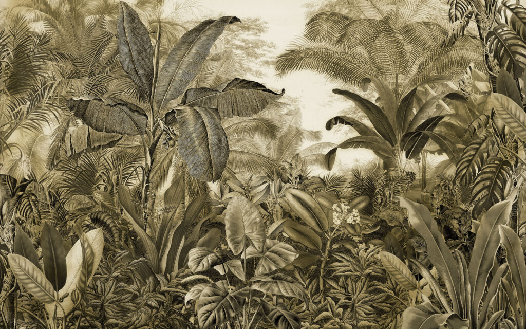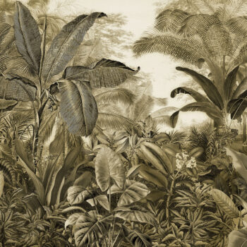In the most hidden depths of the jungle, wild plants and exotic flowers wind their way up towards the sky. There is something mysterious in the air. The sepia colour filter gives the mural an old-fashioned air. Vintage art like this is particularly sought after at the moment.