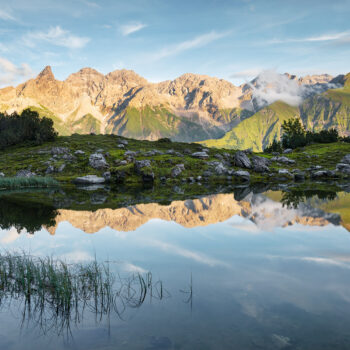 The lofty peaks of the Allgau mountains are mirrored in the crystal-clear mountain waters of Guggersee in Oberstdorf.