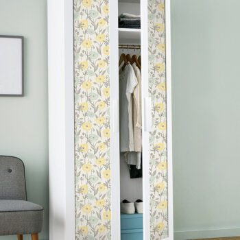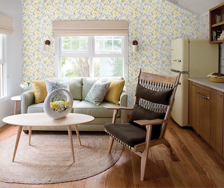Yellow and blue floral peel and stick NuWallpaper print designed by Jen Hewett