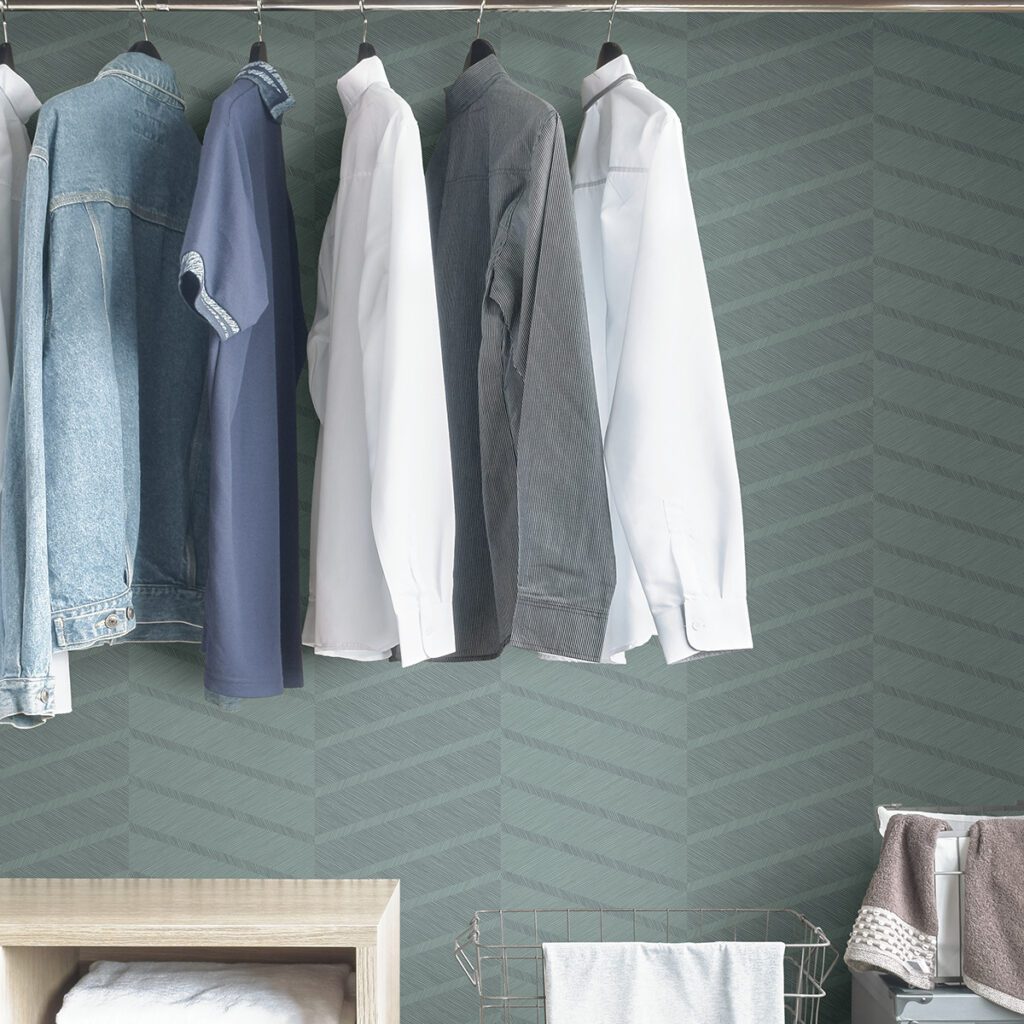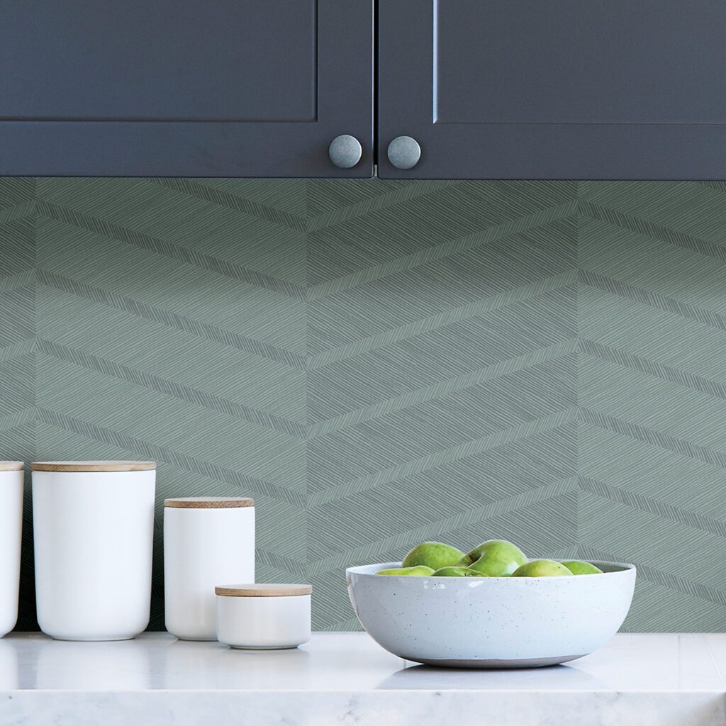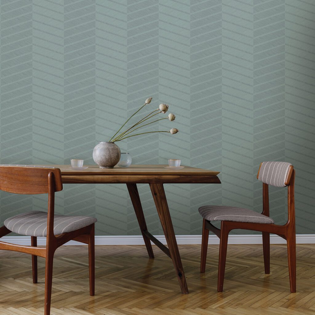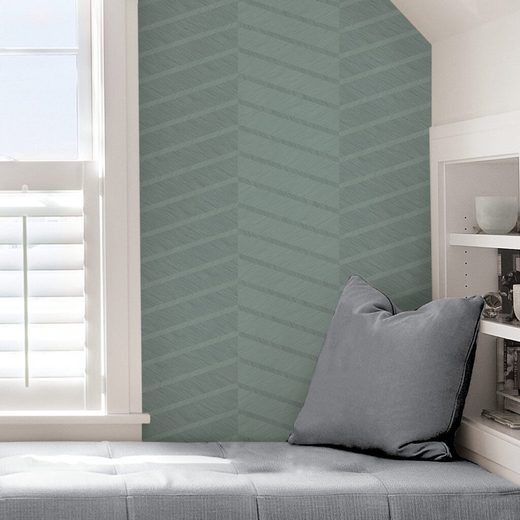 A teal geometric chevron design from the Scott Living Self Adhesive Wallpaper collection