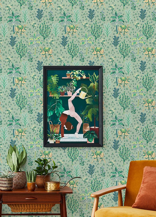 Peel and stick NuWallpaper designed by NuWallpaper featuring tan camels in a green desert oasis scene.