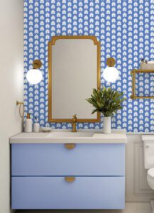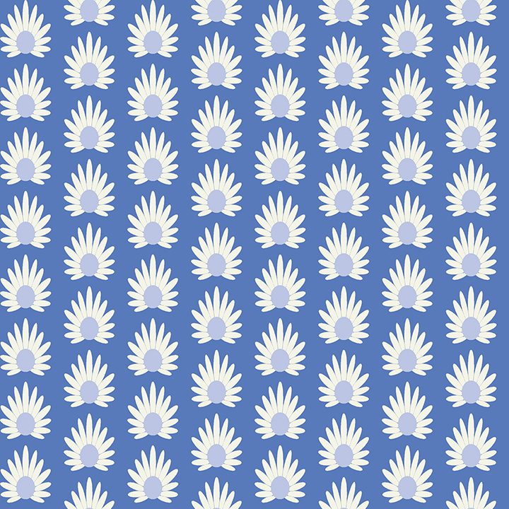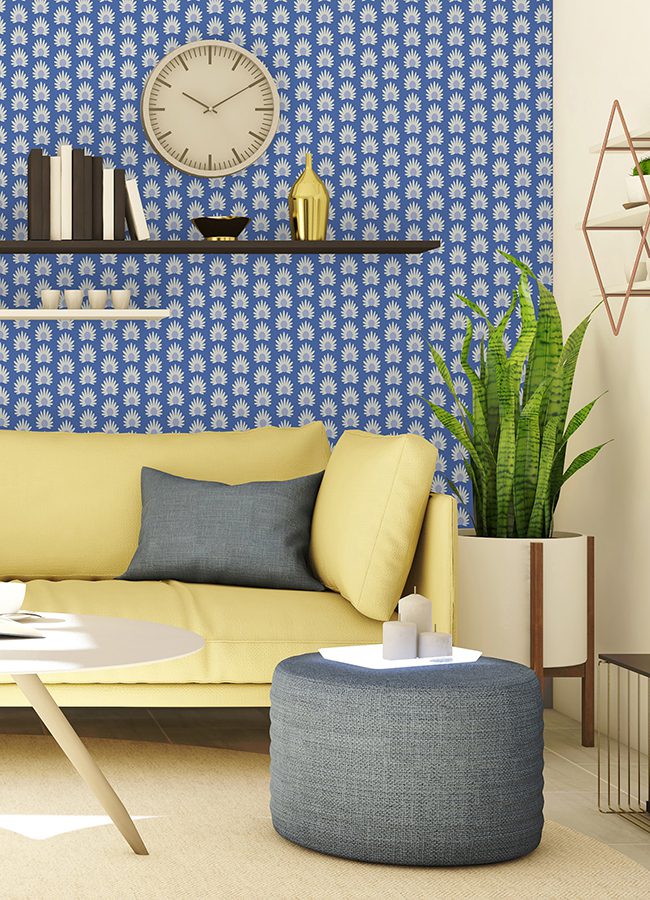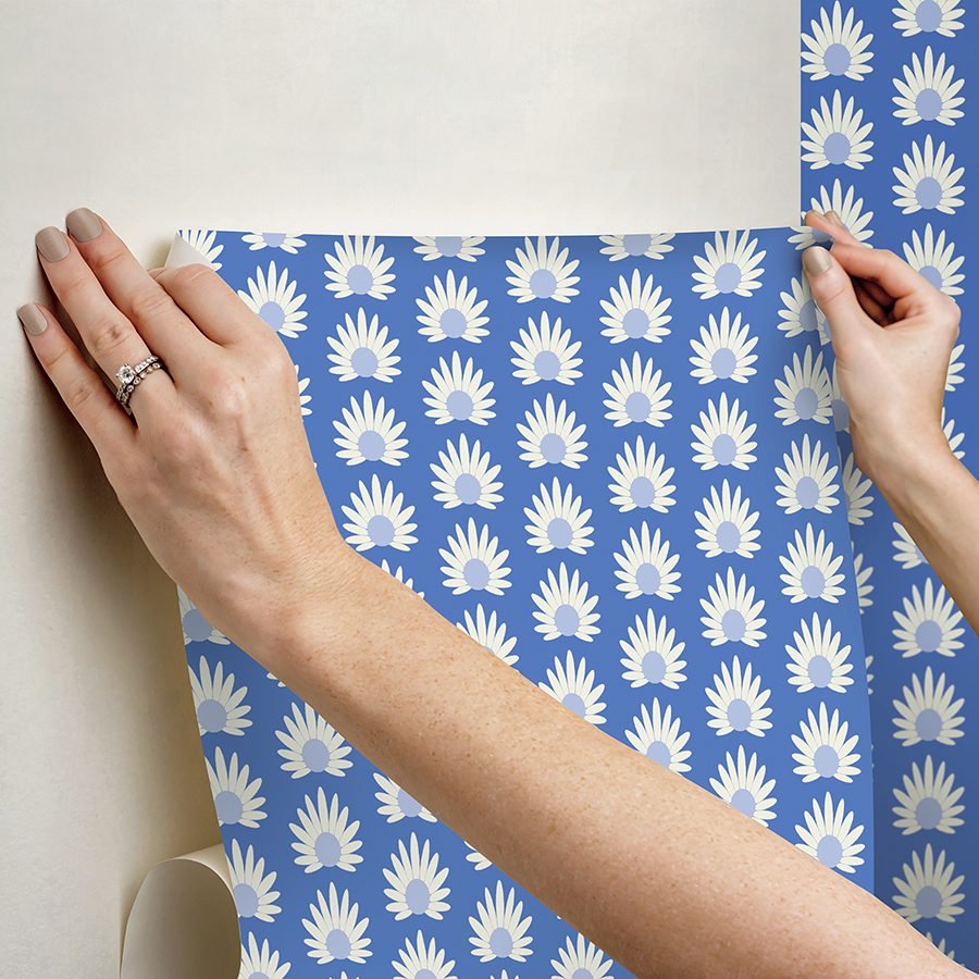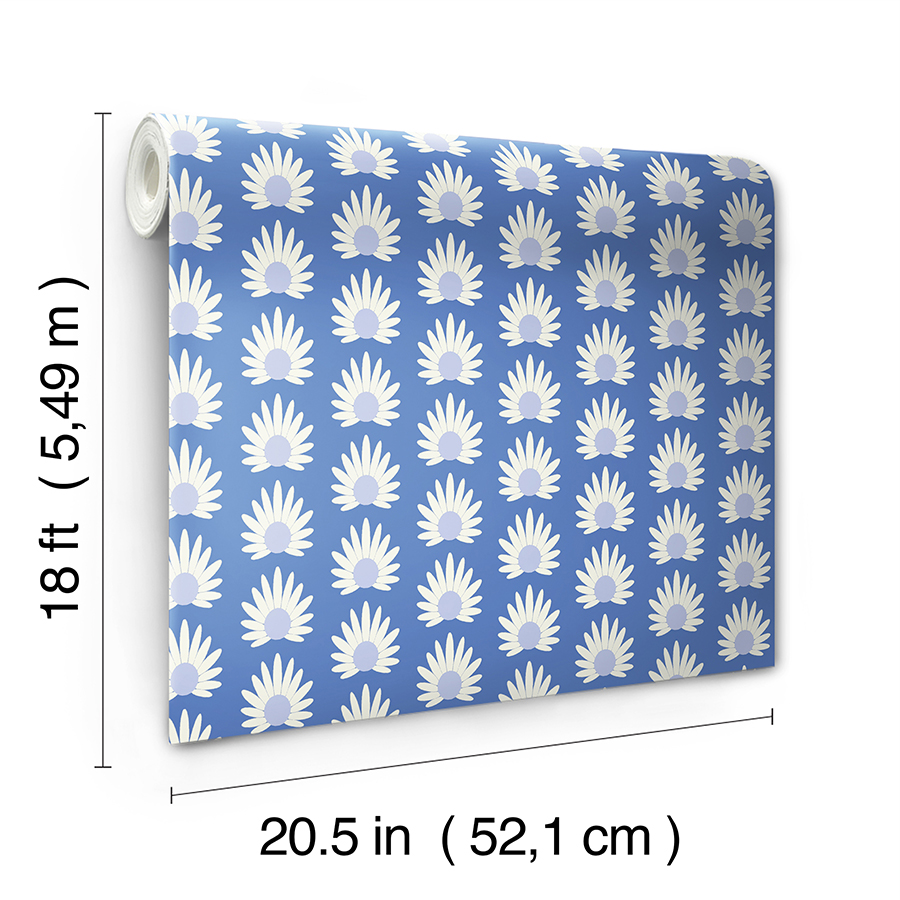 Daisies on blue self adhesive wallpaper designed by Scalamandré.
