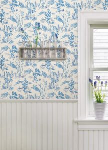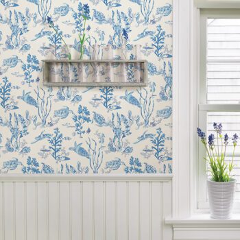 Blue and white seascape toile by Scalamandré on self adhesive wallpaper.