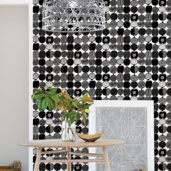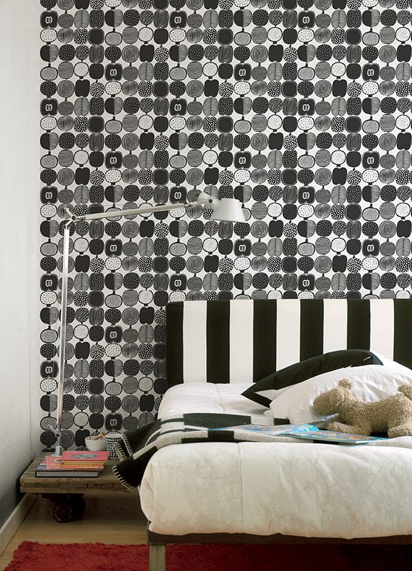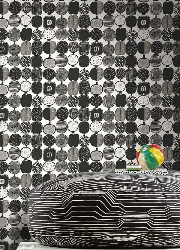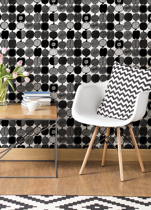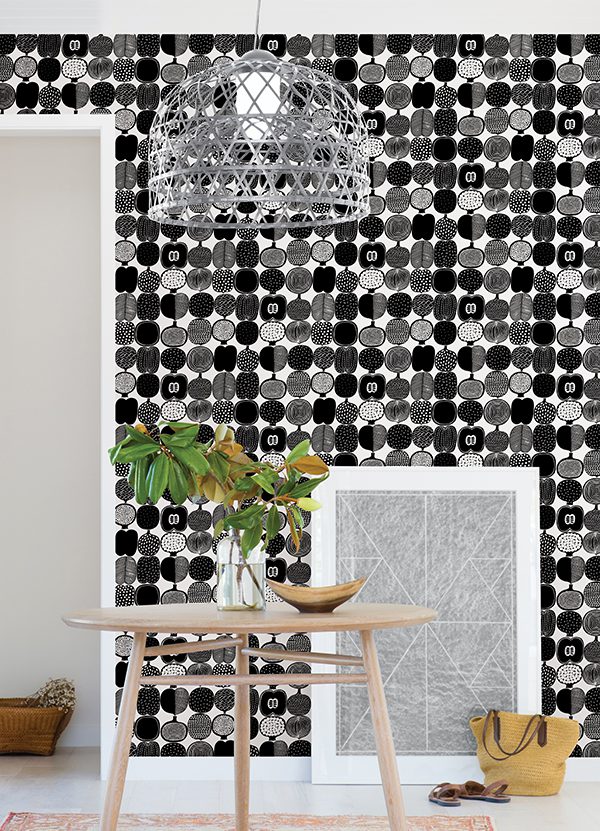 Black and white fruit inspired illustrated peel and stick wallpaper by Marimekko