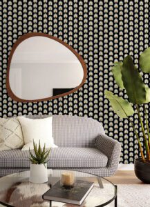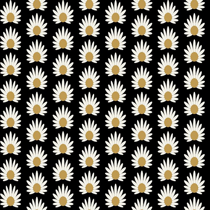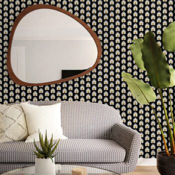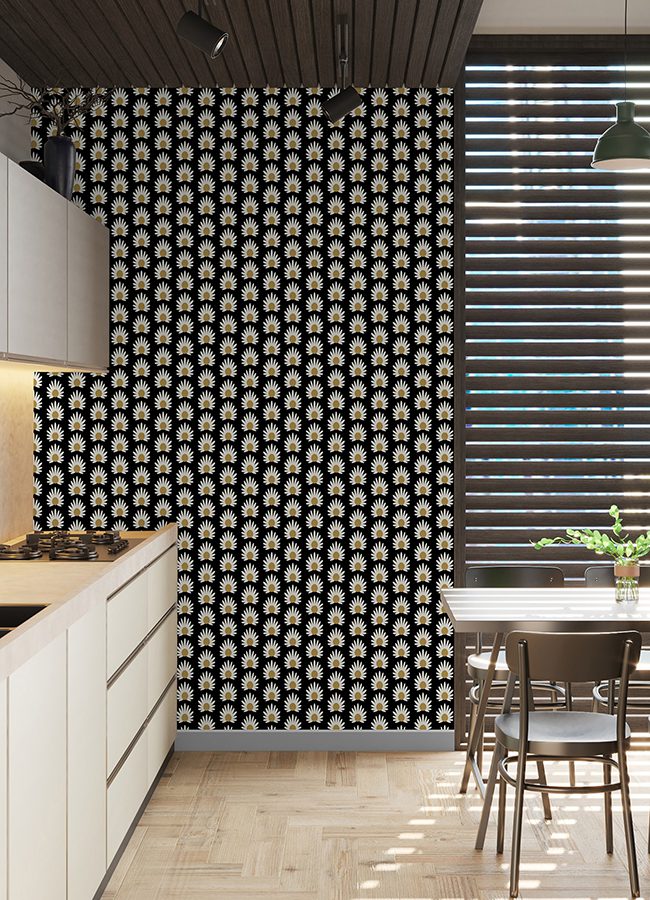 Daisies on black self adhesive wallpaper designed by Scalamandré.
