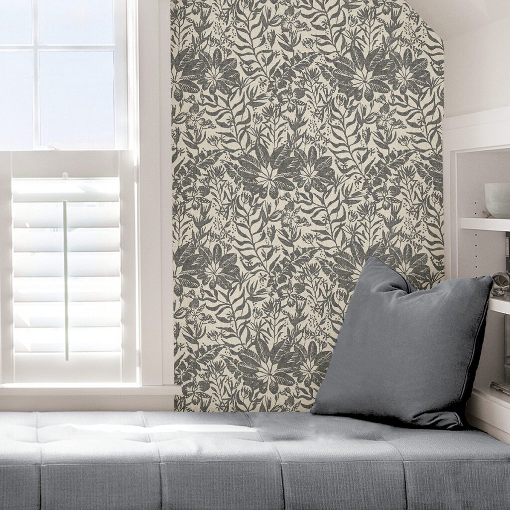 Charcoal leaves float atop an off-white backdrop lending to its contemporary feel. Monochromatic floral peel and stick wallpaper