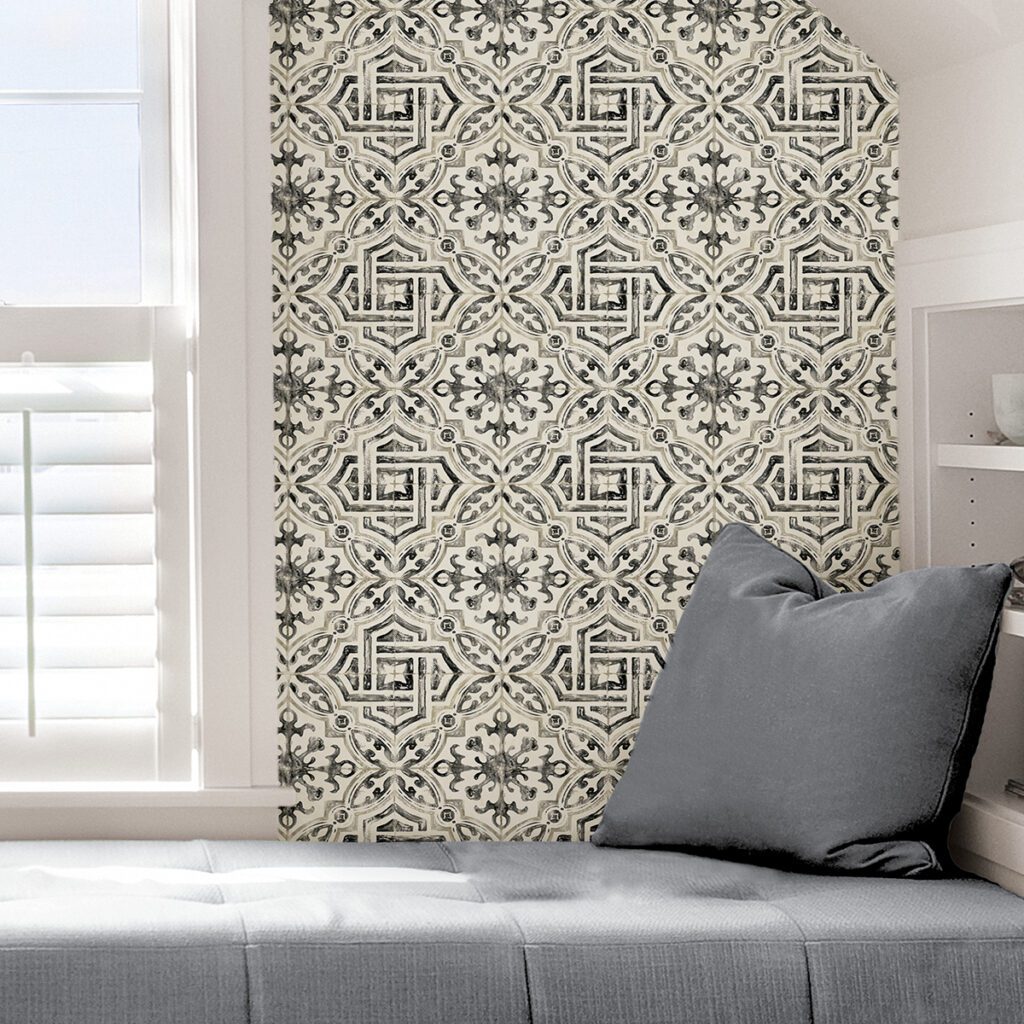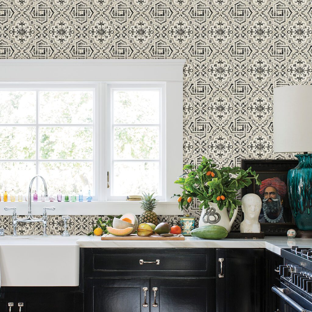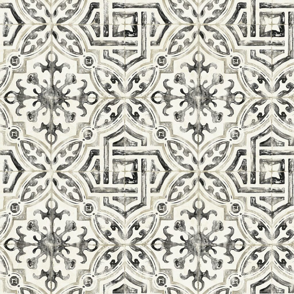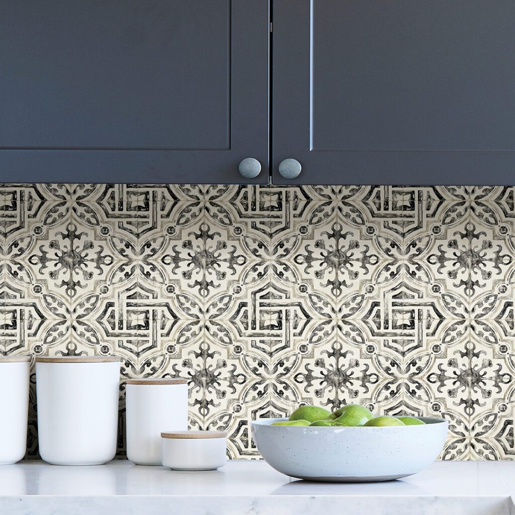 Black and white faux tile peel and stick wallpaper with dramatic, European flair
