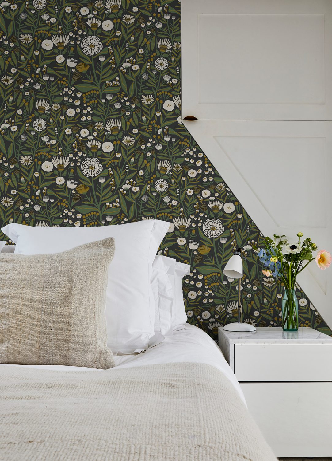 Green floral wallpaper designed by Leah Duncan featuring marigolds