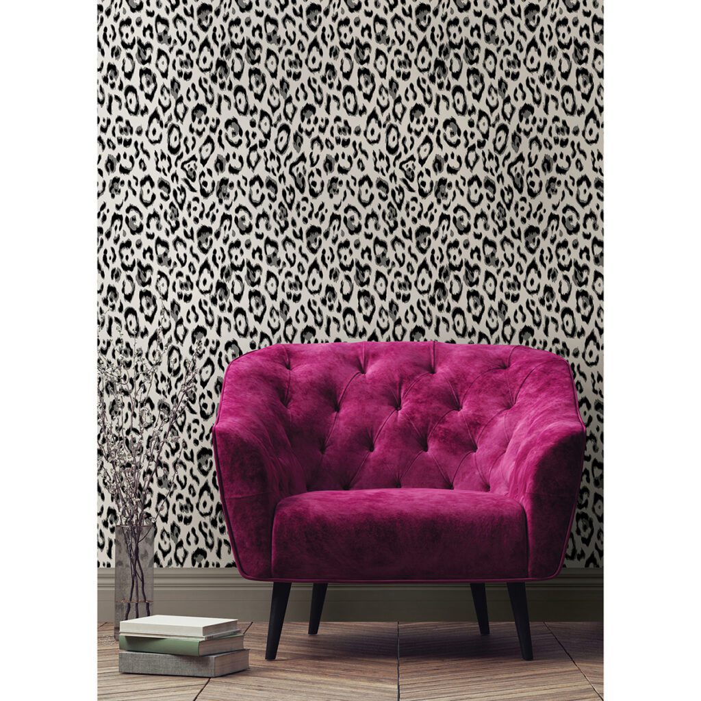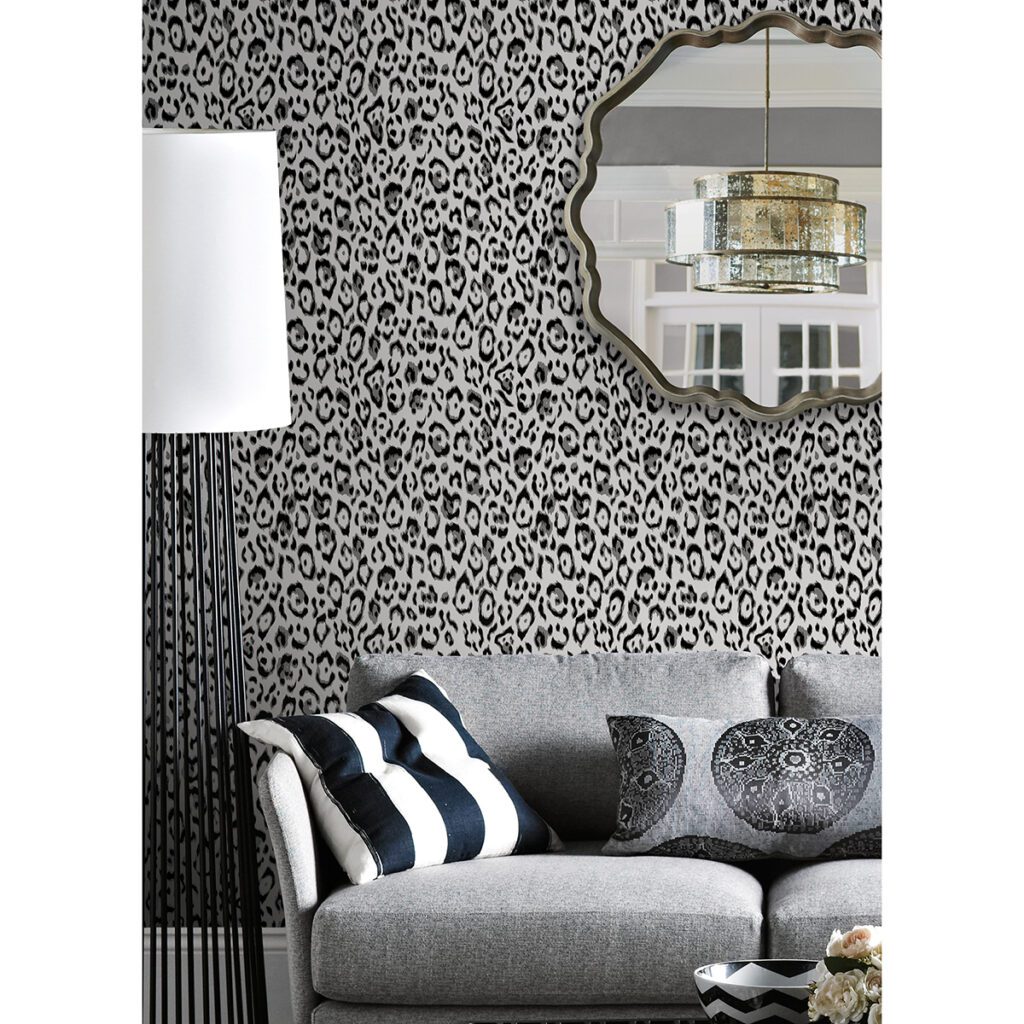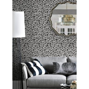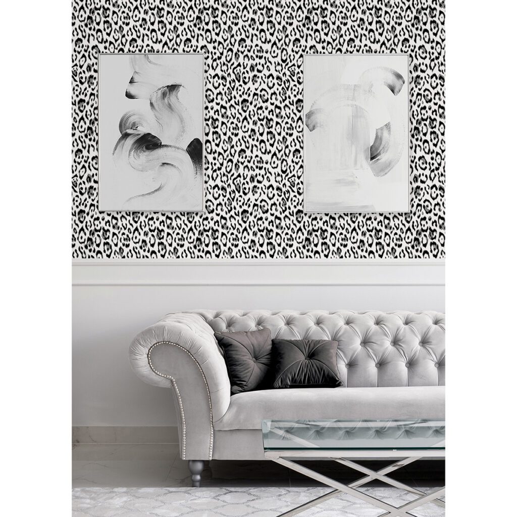 Black and white leopard print peel and stick wallpaper designed by Rachel Zoe