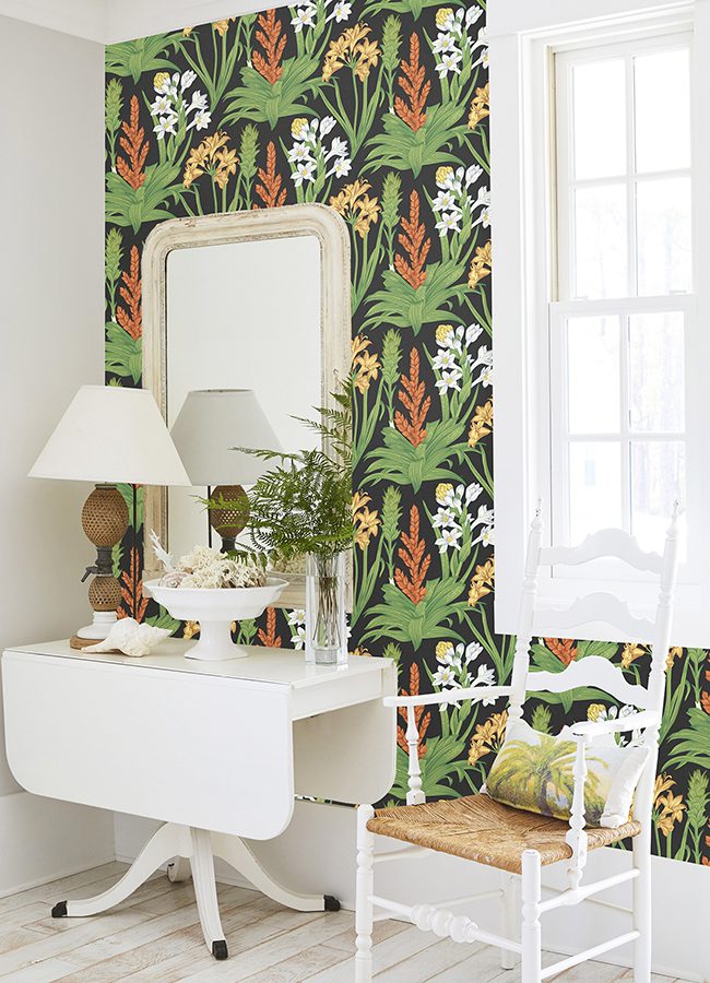 Black multicolour peel and stick NuWallpaper featuring European-inspired botanicals.