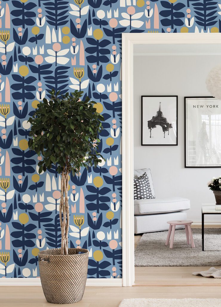 Retro blue floral peel and stick wallpaper designed by Leah Duncan