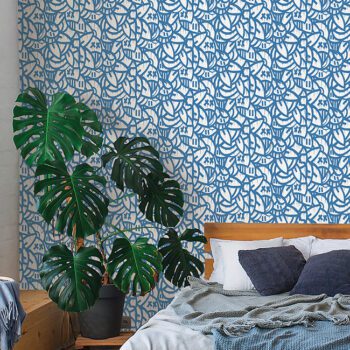 Blue and white graffiti peel and stick wallpaper designed by Arm of Casso.