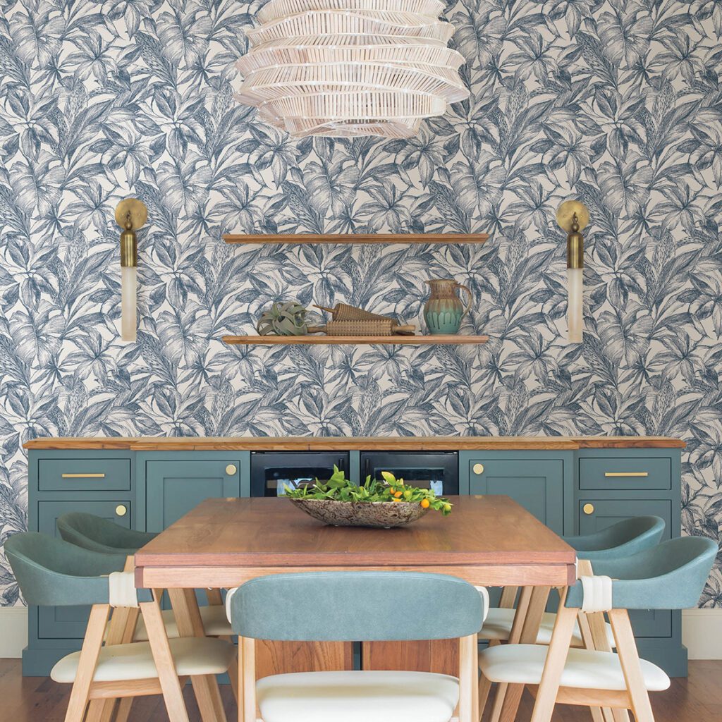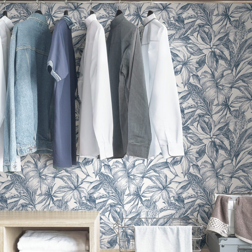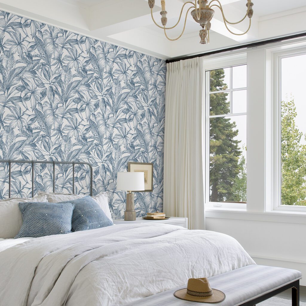 Blue and white tropical leaves peel and stick wallpaper