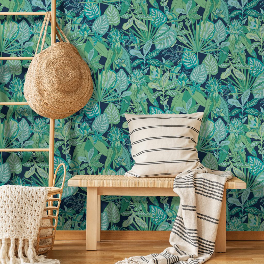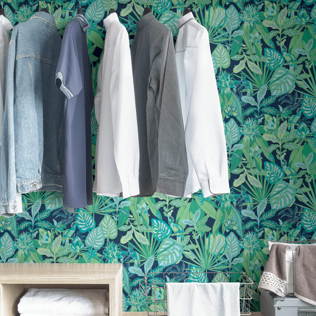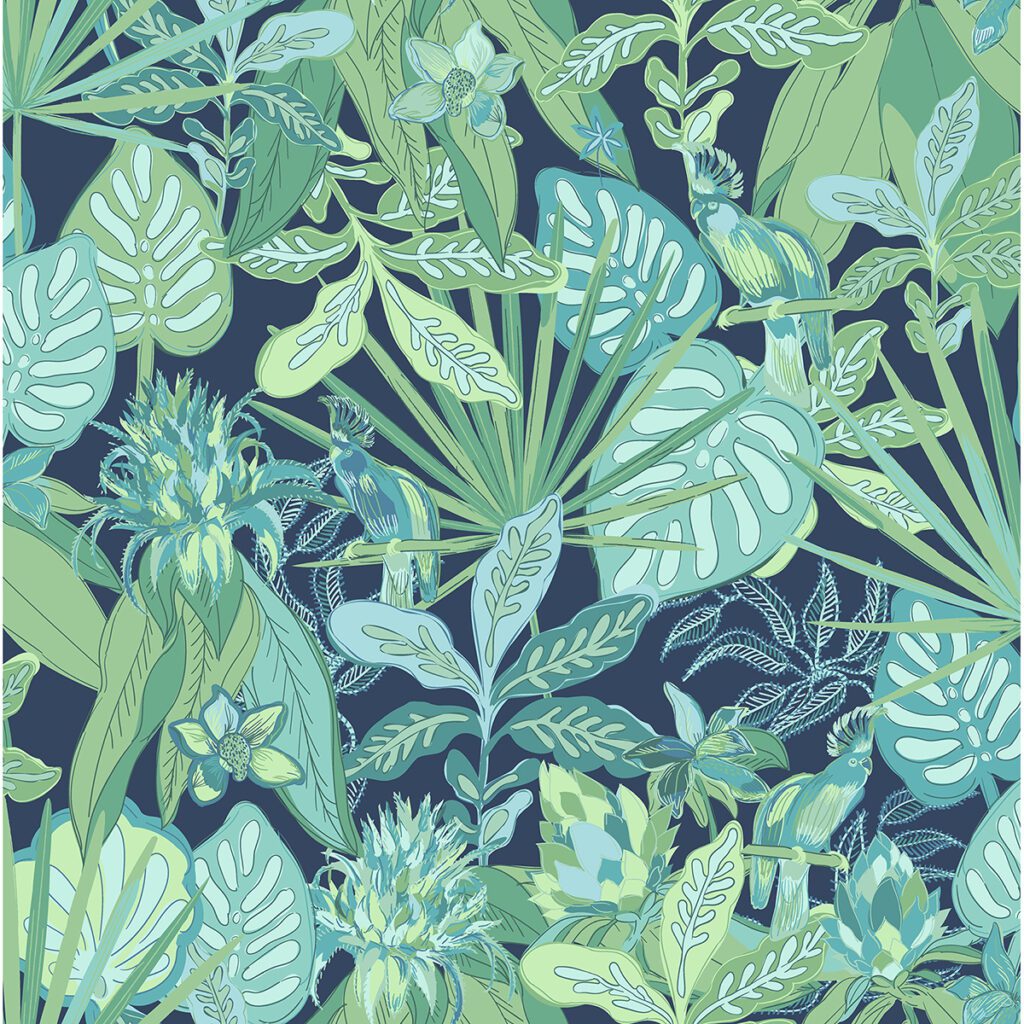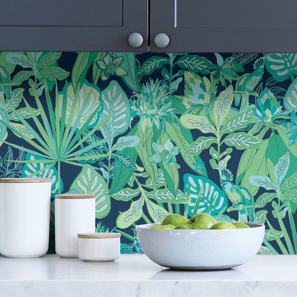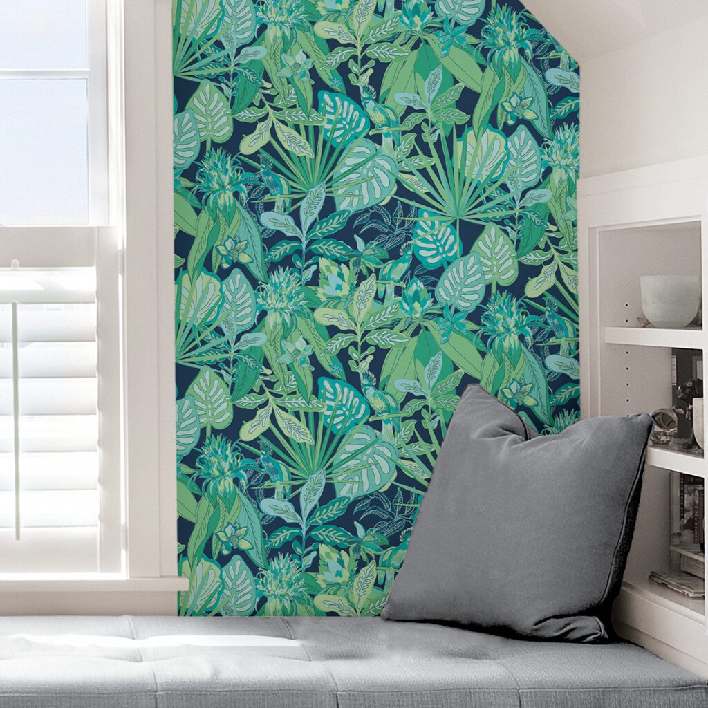 Featuring cute cockatoos and large scale palm leaves, this blue and green botanical design brings a touch of nature indoors. Escape into the tropics with this bold blue and green palm fronds peel and stick wallpaper by Vera Bradley