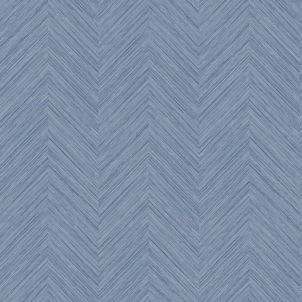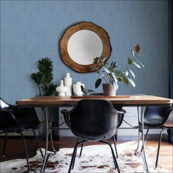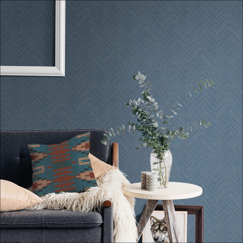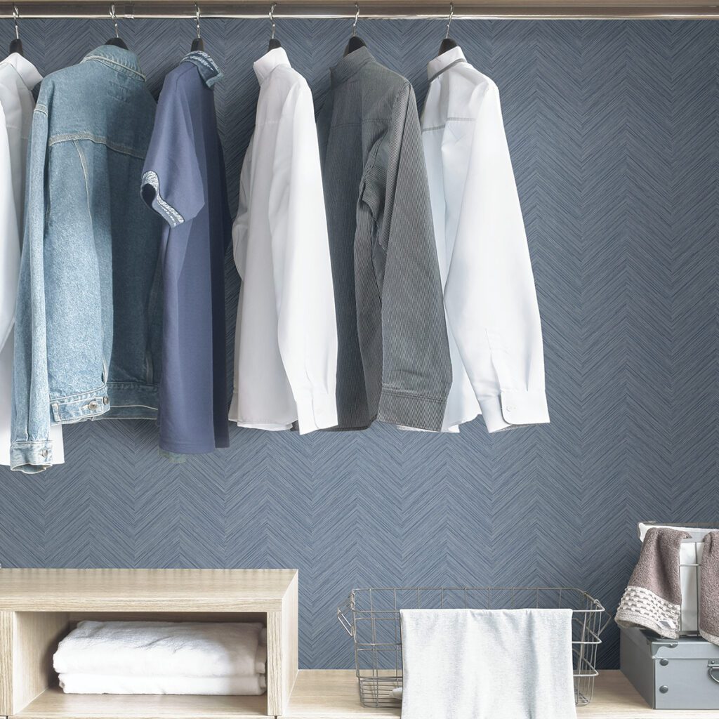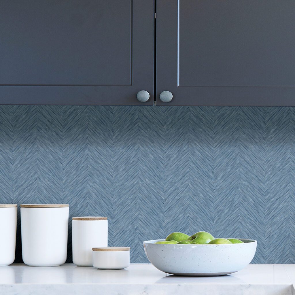 Blue linen inspired peel and stick wallpaper in a chevron pattern