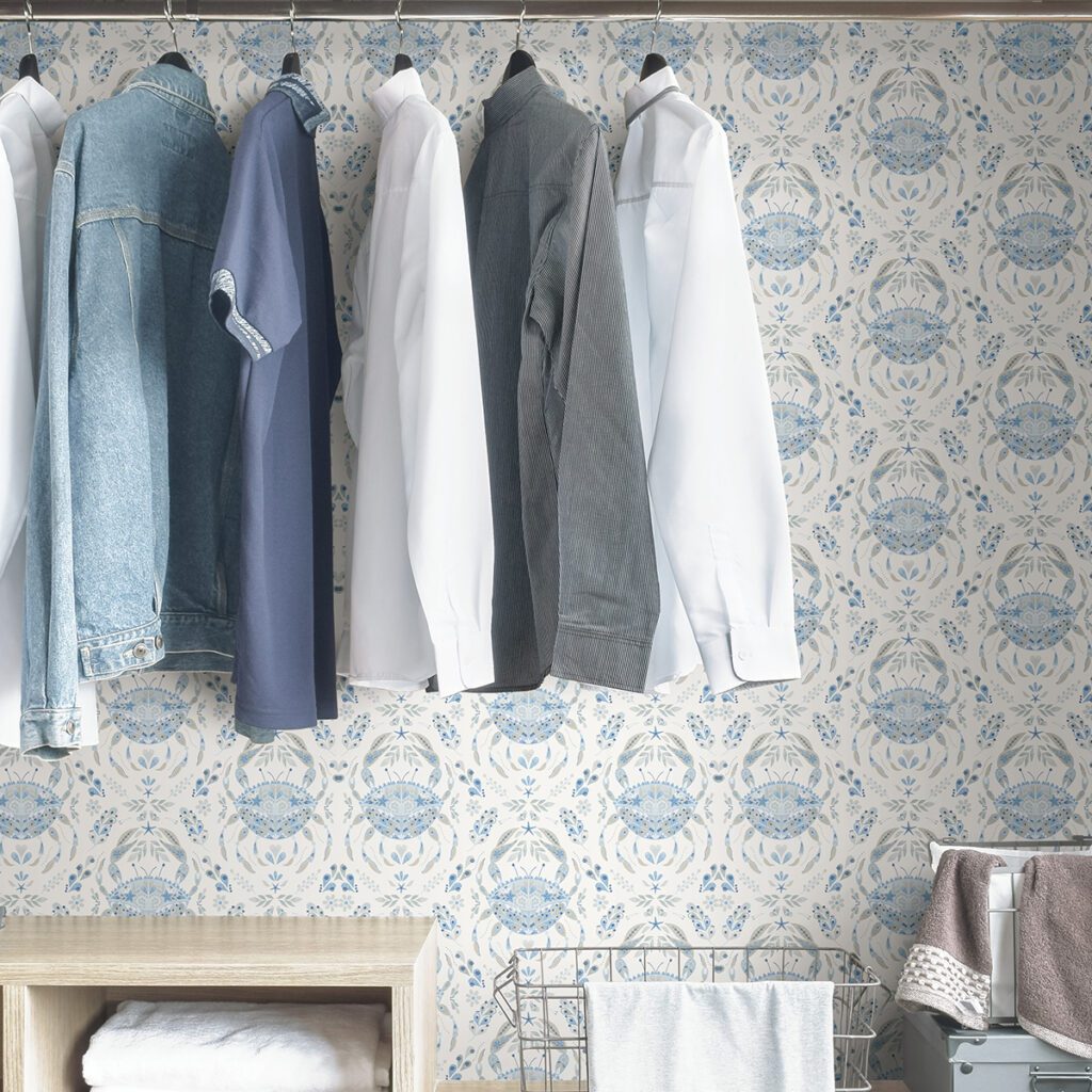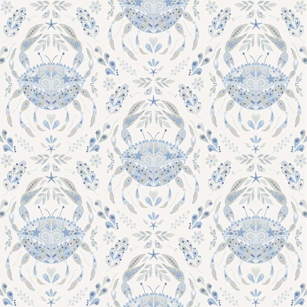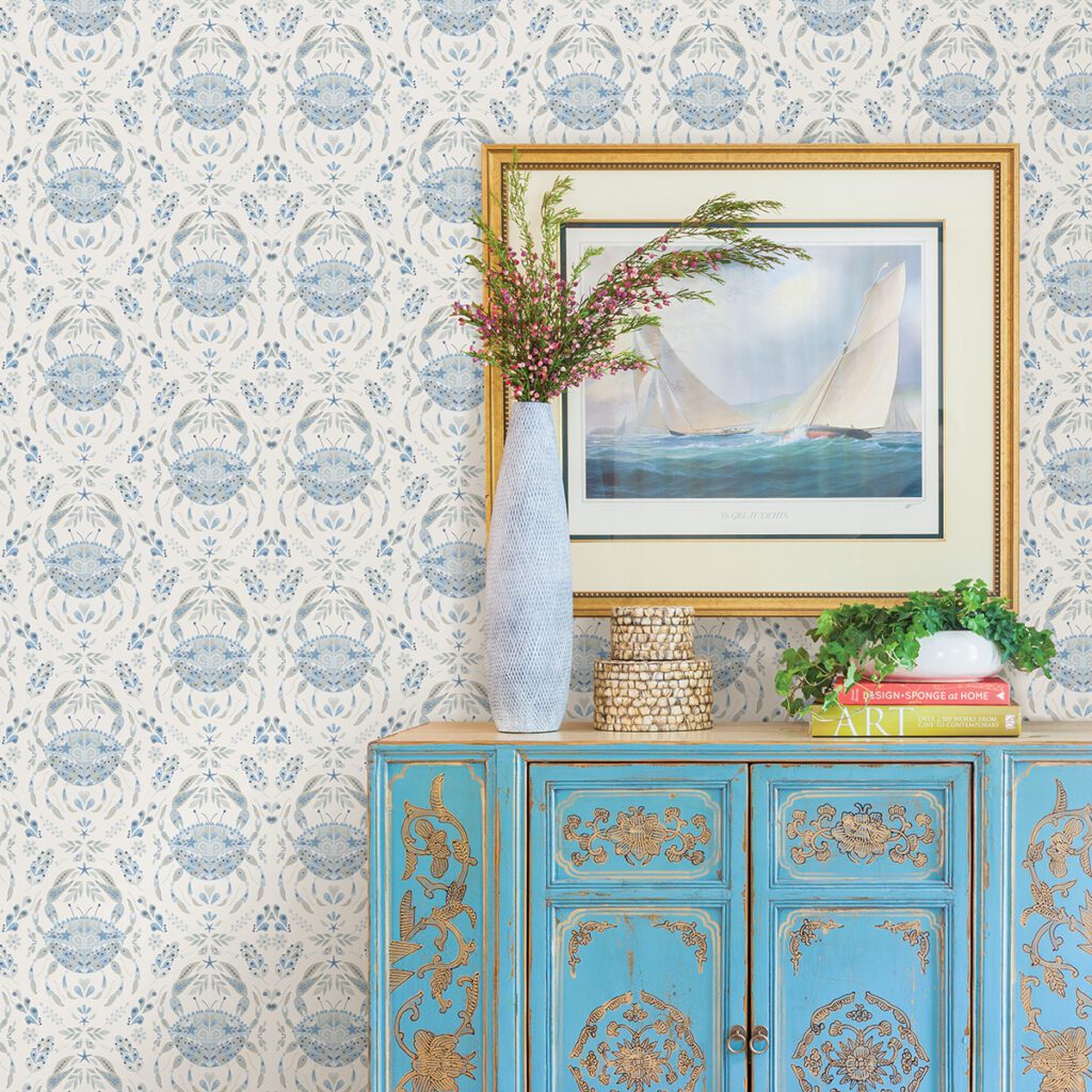 Coastal inspired peel and stick wallpaper with a blue crab damask print