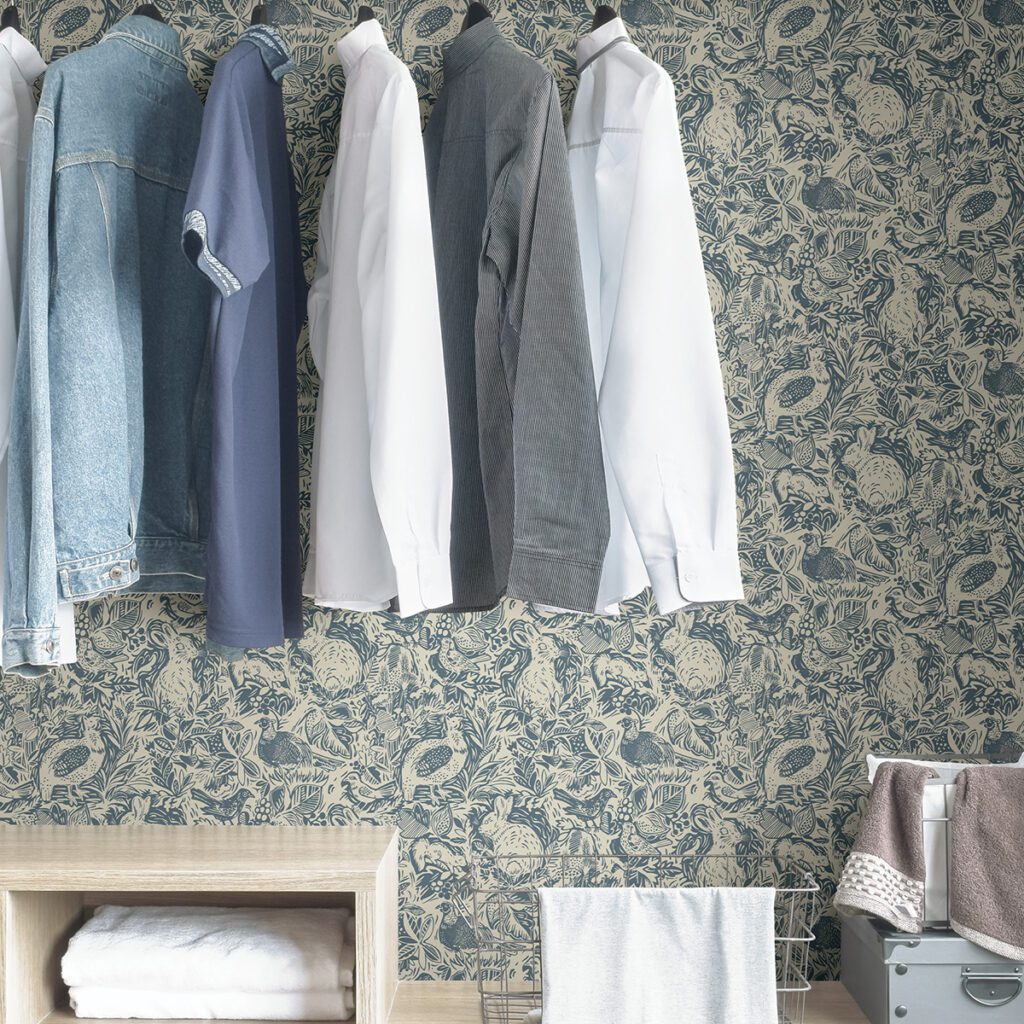 Peel & stick wallpaper featuring blue illustrative woodland print