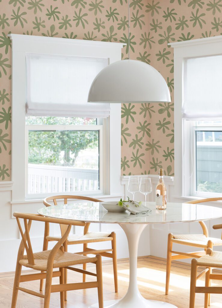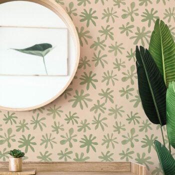 Bohemian pink and green peel and stick wallpaper featuring an abstract floral pattern; designed by Alja Horvat.