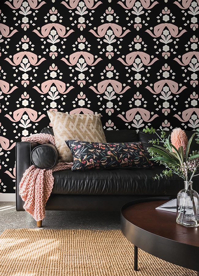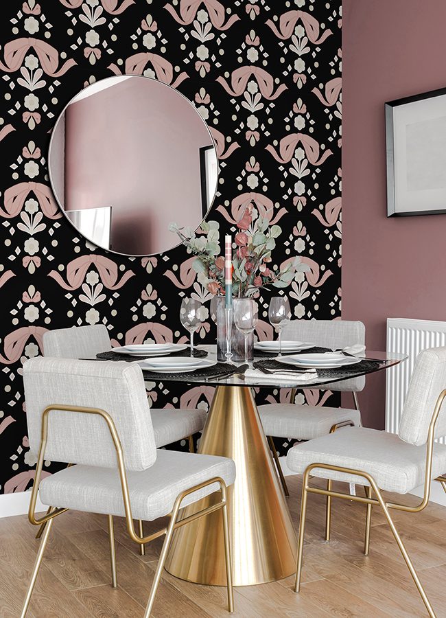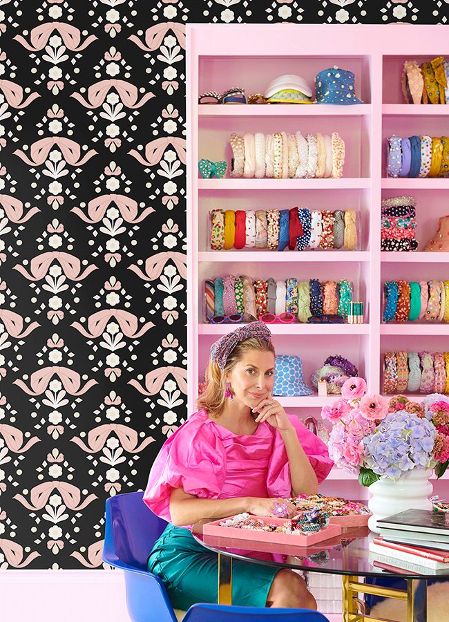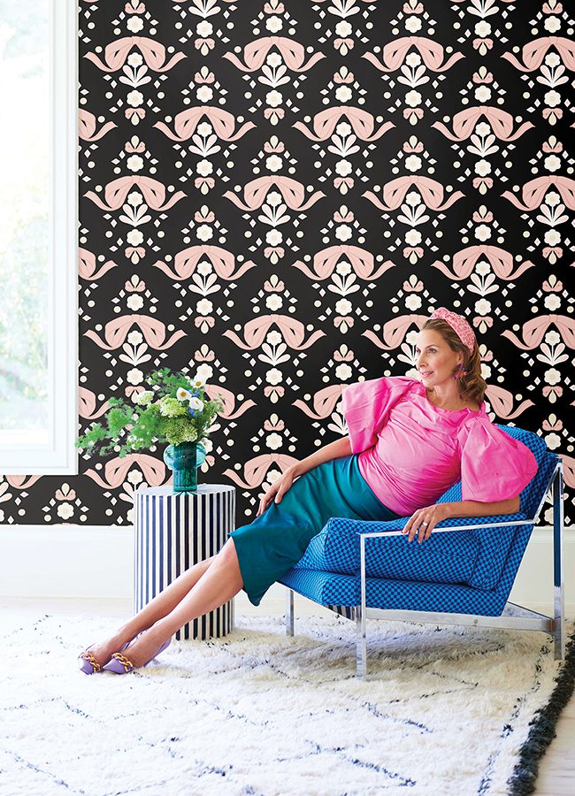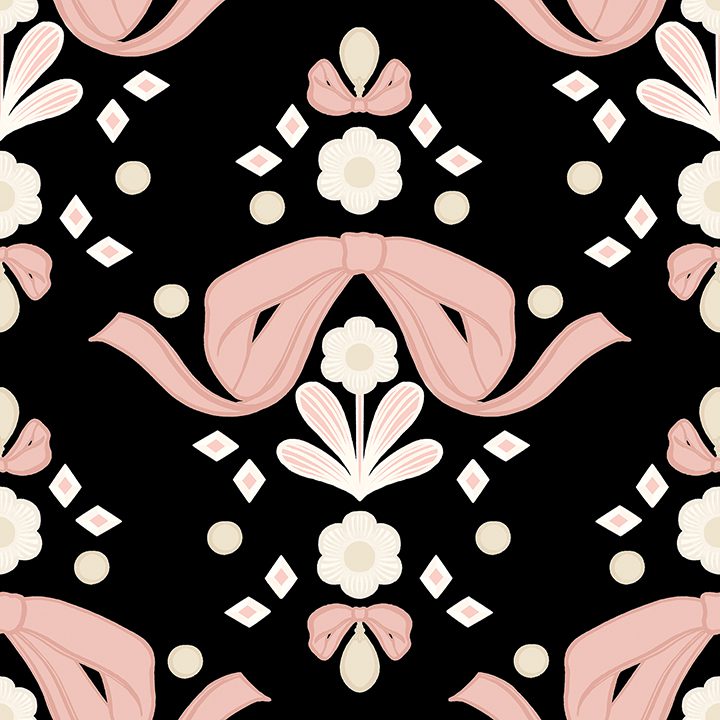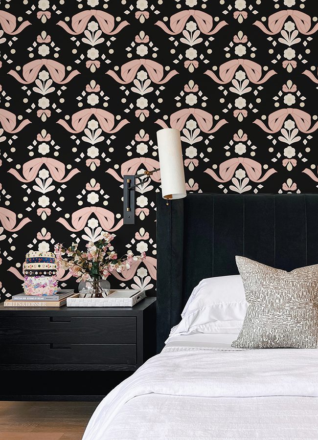 Pink and black ribbon bow damask print designed by Lele Sadoughi on peel and stick NuWallpaper