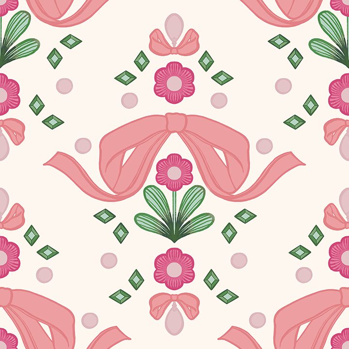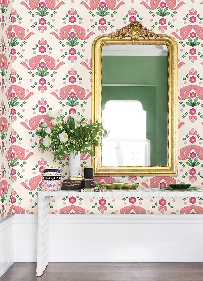 Pink and ivory ribbon bow damask print designed by Lele Sadoughi on peel and stick NuWallpaper