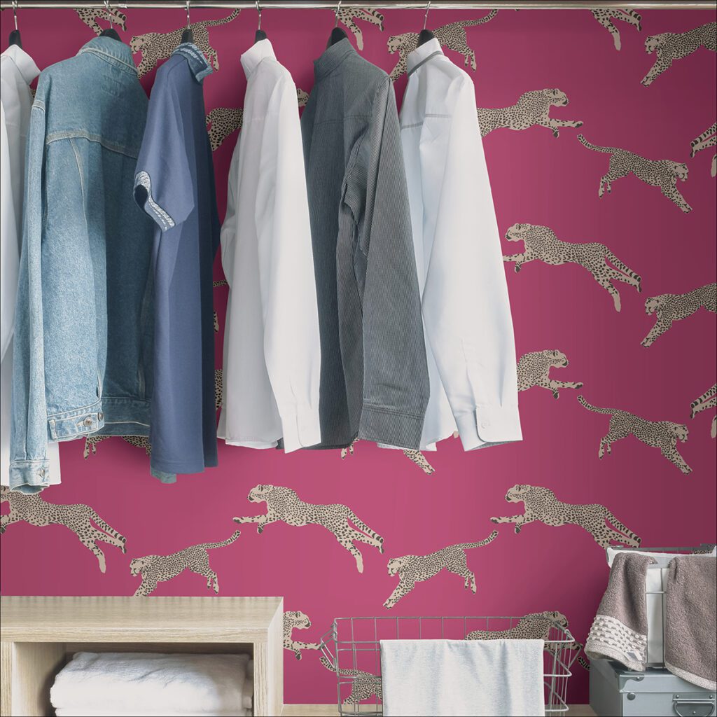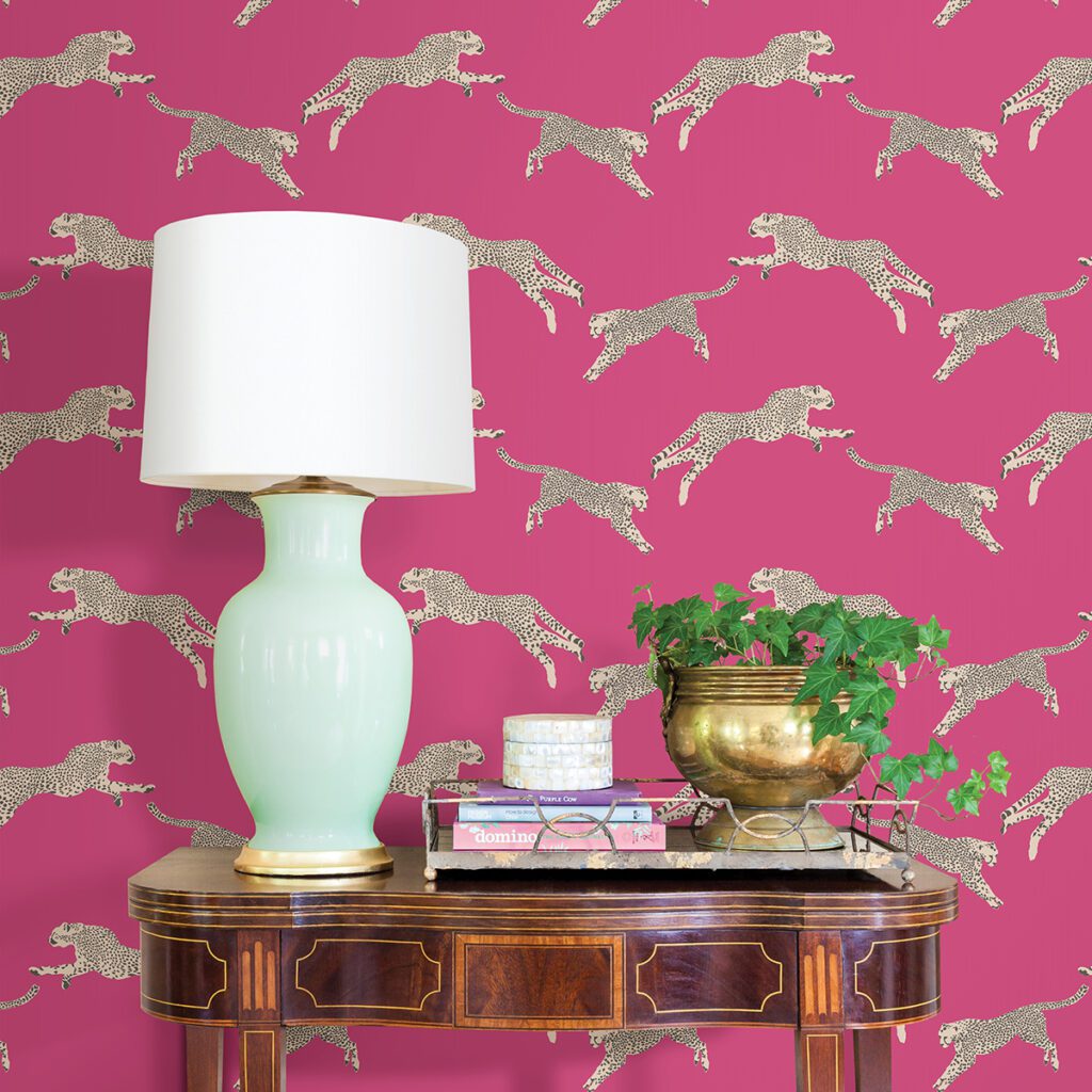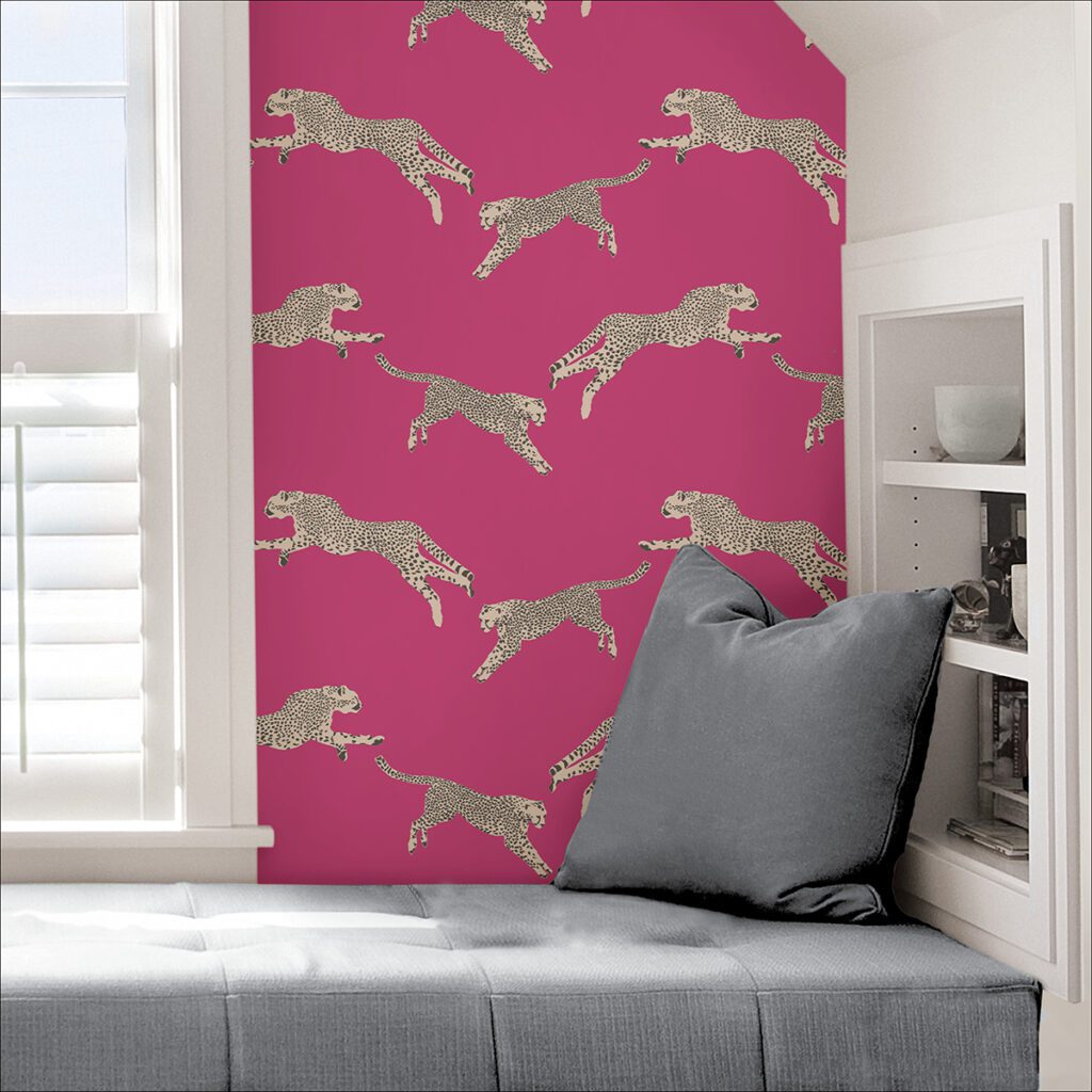 Pink leaping cheetah print peel and stick wallpaper by Scalamandré