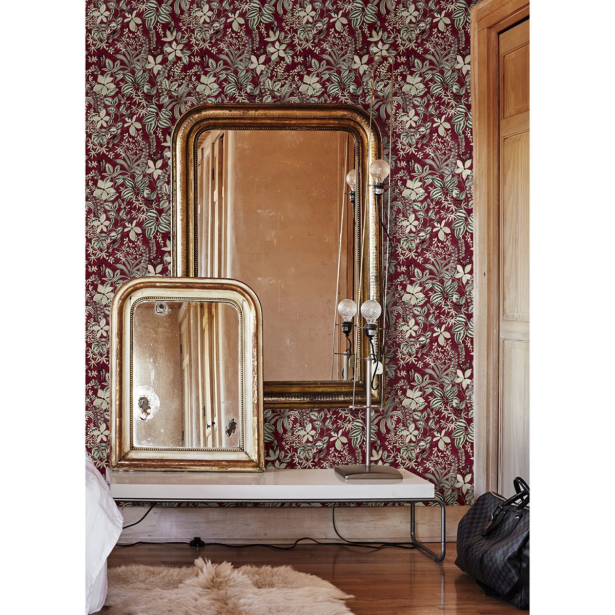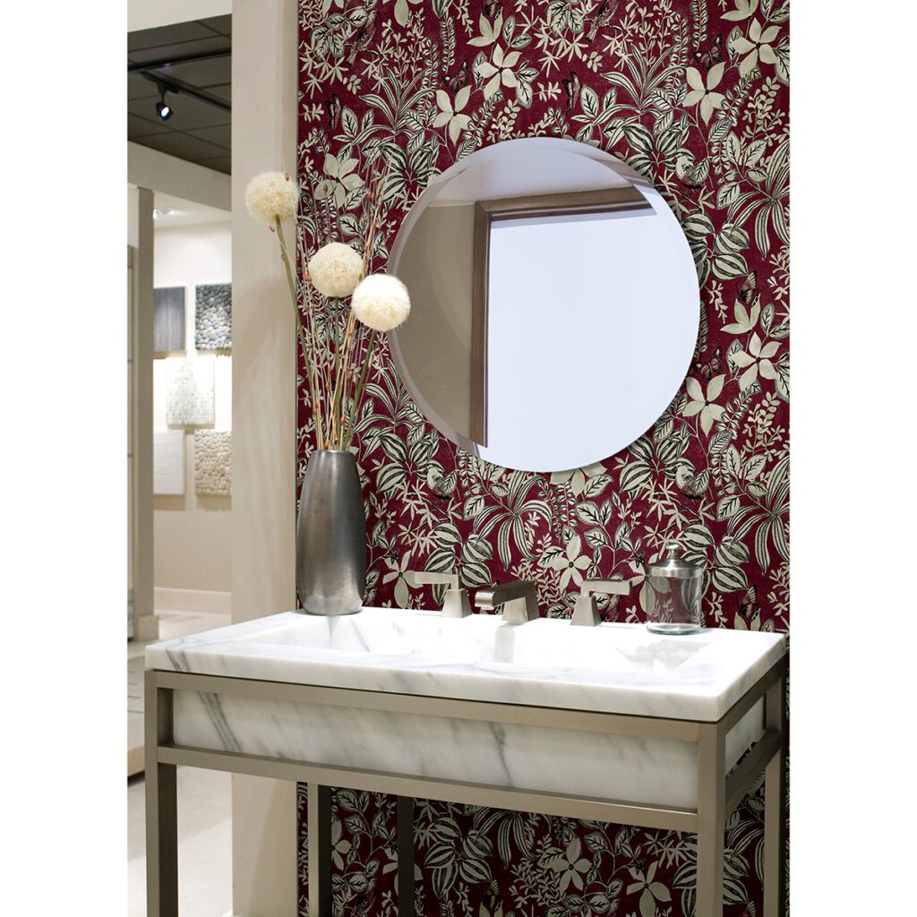 Burgundy floral peel and stick wallpaper designed by Rachel Zoe