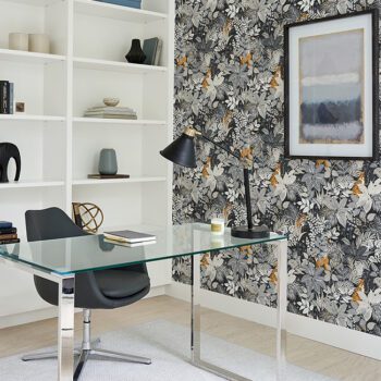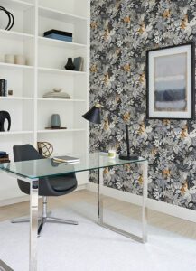 Peel and Stick NuWallpaper designed by NuWallpaper featuring a charcoal colored rainforest filled with cheetahs, tigers, and lemurs.
