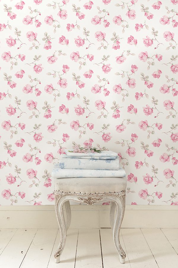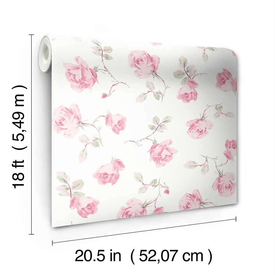 Peel and stick wallpaper by LoveShackFancy featuring a scattering of stemmed pink roses