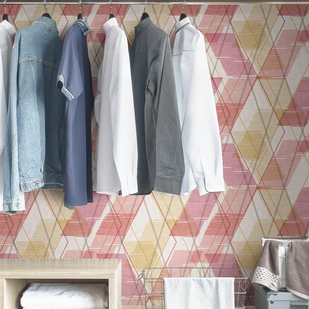 Pink, red, and yellow argyle peel and stick wallpaper
