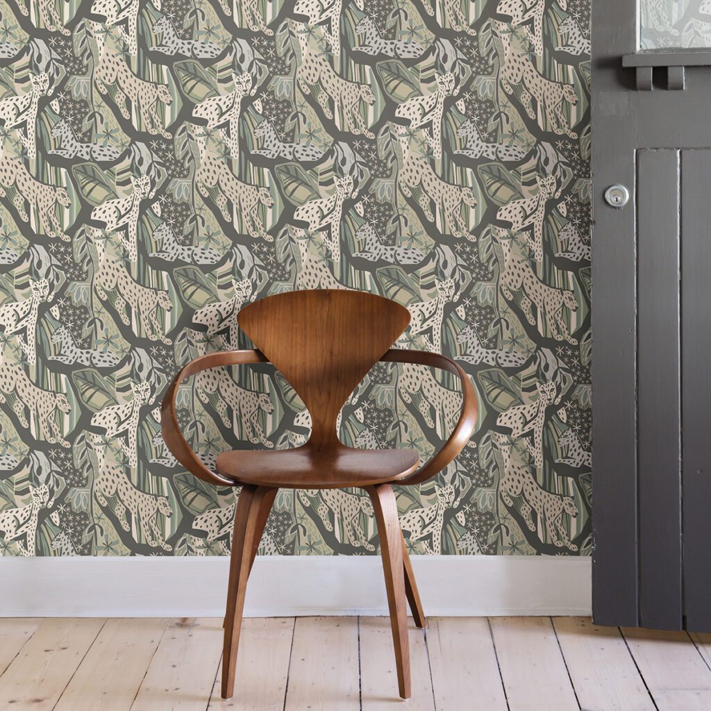 Peel and stick wallpaper featuring cheetahs and a neutral coloured palette