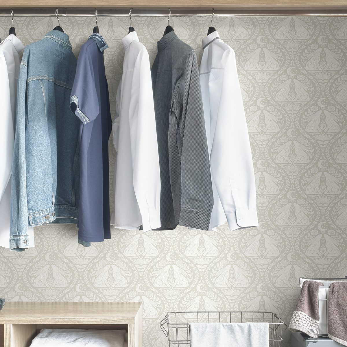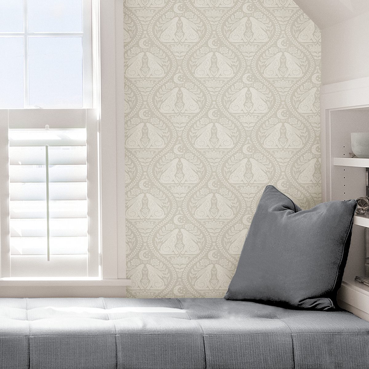 Taupe Scandi damask peel and stick wallpaper – Rabbits sit amongst the flowers under the moonlight in this whimsical peel and stick wallpaper.