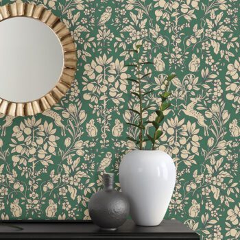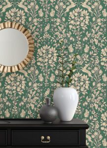 Emerald green peel and stick wallpaper with a woodland theme