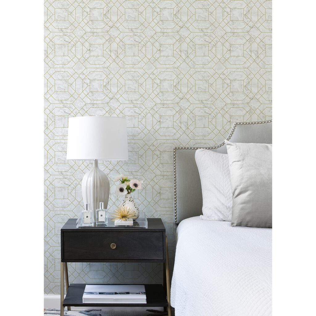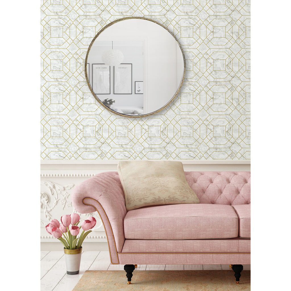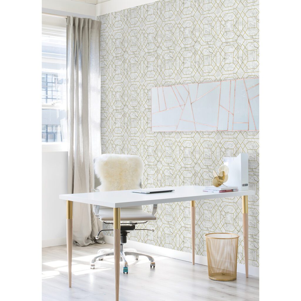 Gold marbled geometric peel and stick wallpaper designed by Rachel Zoe